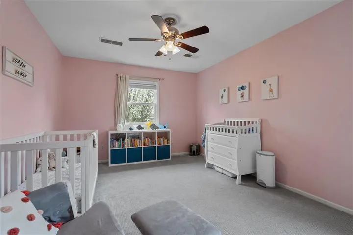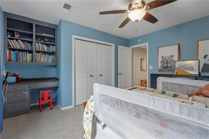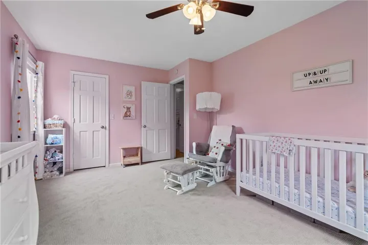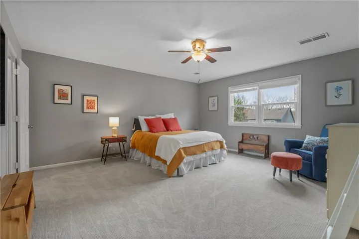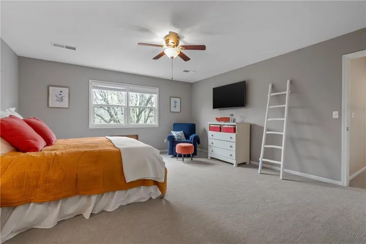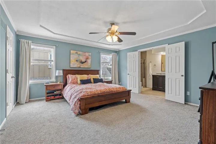 "LongDescription" => "Bedroom with light colored carpet, a ceiling fan, a raised ceiling, and recessed lighting"