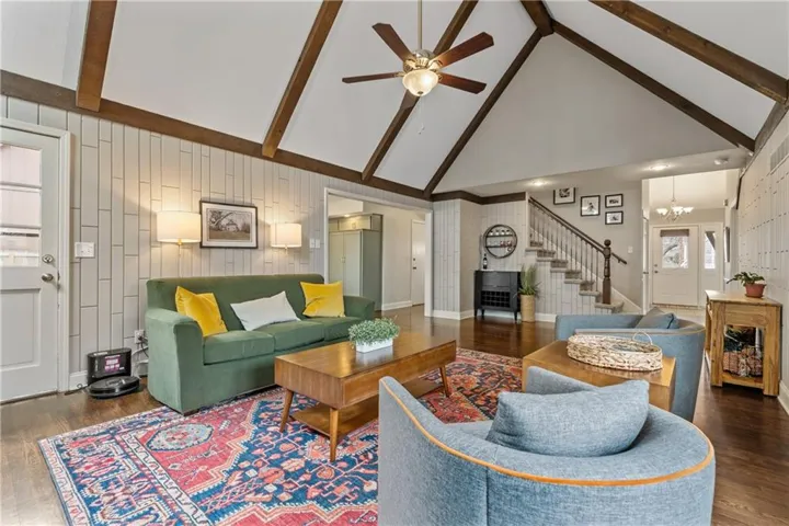 "LongDescription" => "Living area with beam ceiling, a tile fireplace, recessed lighting, and wood finished floors"