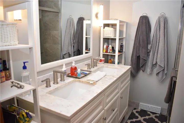 +"PublicRemarks": "Wonderful split entry home with lots of NEW!! Recent updates include new exterior paint, high efficiency furnace and air, and remodeled baths! Beautiful kitchen with new quartz countertops, backsplash, gas range, and pantry. Living room features hardwood floors, high vaulted ceilings with floor to ceiling brick fireplace. Master bedroom has two closets including a walk-in closet. Finished family room in lower level with full bath. Rare find with workshop/hobby room added on to rear of garage. Backyard features a deck and fenced yard, plenty of trees for shade."