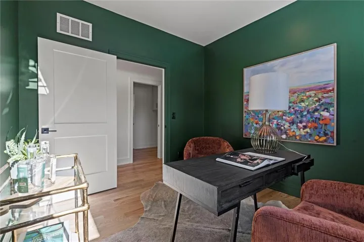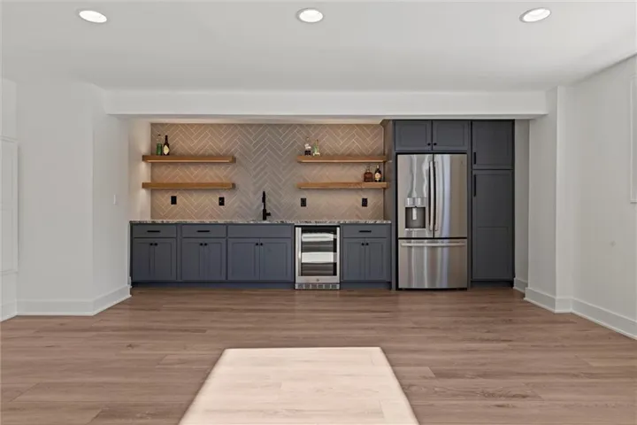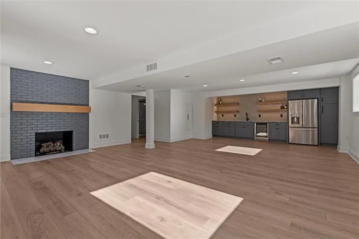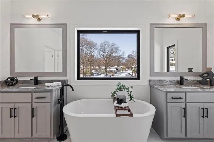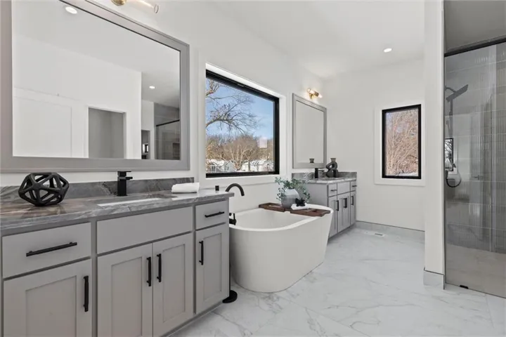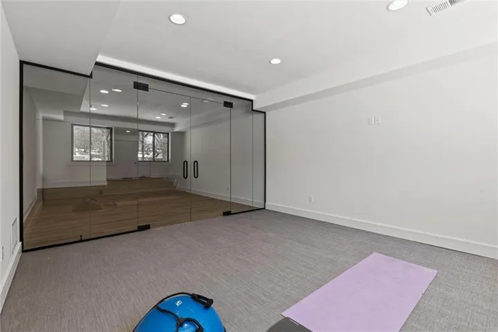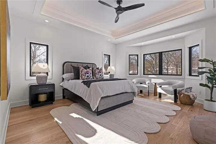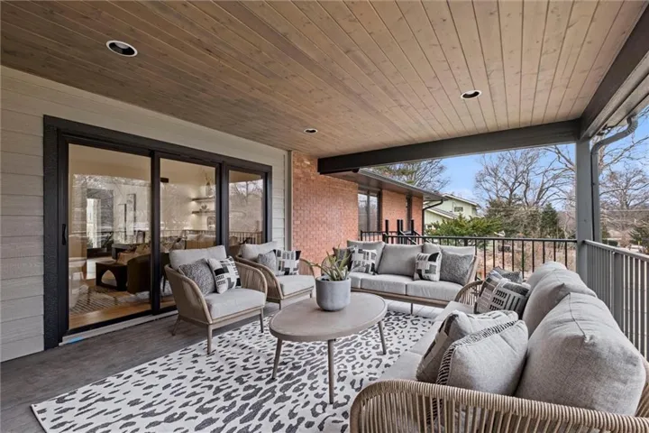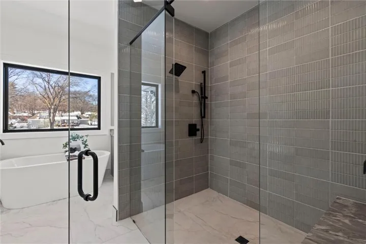 +"PublicRemarks": "One of a kind luxury retreat – a completely reimagined Leawood ranch on a sprawling 3/4 acre lot overlooking two serene ponds. The chef’s kitchen features gourmet Jenn-Air & Miele appliances, walk-in pantry, custom walnut cabinetry, and a dramatic 8ft quartzite waterfall edge island. The airy vaulted living room opens to the kitchen with floating illuminated walnut shelves and a fireplace with remote timer. Entertain on the covered lanai with black quartz fireplace, stained wood ceiling and composite decking with a wall of glass opening to the living room; it's a lovely open air extension of your living space. The owner's wing offers peaceful sunset pond views on your fresh air terrace, an indulgent soaking tub, an XL zero-entry shower with dual heads, and a custom walk-in closet with fully adjustable built-in cabinetry and laundry room. A sophisticated office space is near the primary suite for work from home flexibility or nursery possibilities. Stylish organization station has floor-to-ceiling built-ins, a coffee bar & pantry. Impressive foyer with oak herringbone flooring, custom crafted waterfall edge staircase with modern luxe 15ft spiral lighting. 3 addtl main level bedrooms and 2 baths including an emerald tiled shower and a luxurious guest suite with private bath. The lower level has endless possibilities for entertainment, with a wet bar, GE Profile wine fridge, full size refrigerator, custom cabinetry, designer tile, floating white oak shelving and knurling hardware, spacious family room with sleek brick fireplace, a media room with floating underlit built-in cabinets. Additional spaces include a game room, a gym studio with fitness flooring and 9ft tall glass wall, and a third garage ideal for a boat, car, or workshop. With practical features including smart thermostats, security lighting, WiFi-enabled garage dr openers, new Anderson casement windows, and 96% high-efficiency zoned HVAC systems, this home offers ultimate comfort and peace of mind."