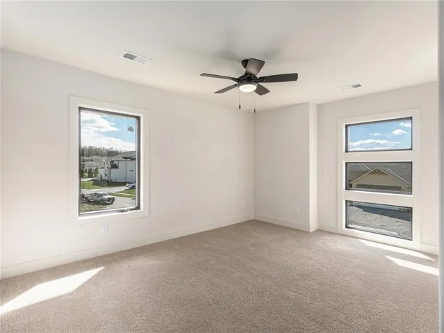 A well-appointed home office is conveniently located near the front entrance, alongside a stylish powder room for guests. Retreat to the luxurious Master Suite, designed with today's lifestyle in mind, featuring a beautifully appointed TV and fireplace wall, along with a vaulted ceiling that enhances the sense of space. The spa-like master bathroom is an oasis, showcasing a double vanity, a spacious shower, a free-standing tub, and an expansive walk-in closet. Indirect LED lighting elegantly highlights cabinetry and shower spaces, adding a touch of sophistication. The additional bedrooms are generously sized and feature unique modern windows, ensuring plenty of natural light.\r\n