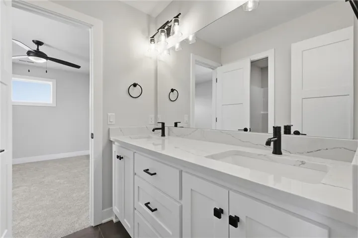 "LongDescription" => "Bathroom with vanity, dark wood-type flooring, recessed lighting, and washtub / shower combination"