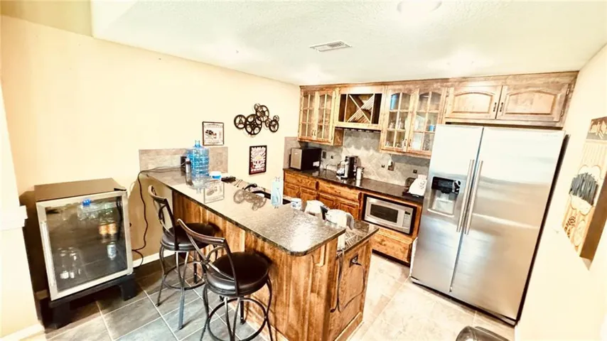 "LongDescription" => "Kitchen with appliances with stainless steel finishes, white cabinetry, tasteful backsplash, a breakfast bar area, and recessed lighting"