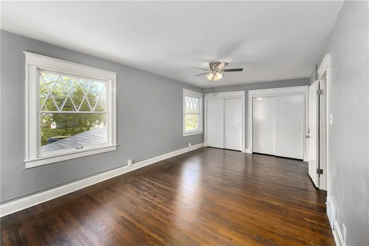 "LongDescription" => "Bedroom with a tray ceiling, a ceiling fan, and dark wood finished floors"