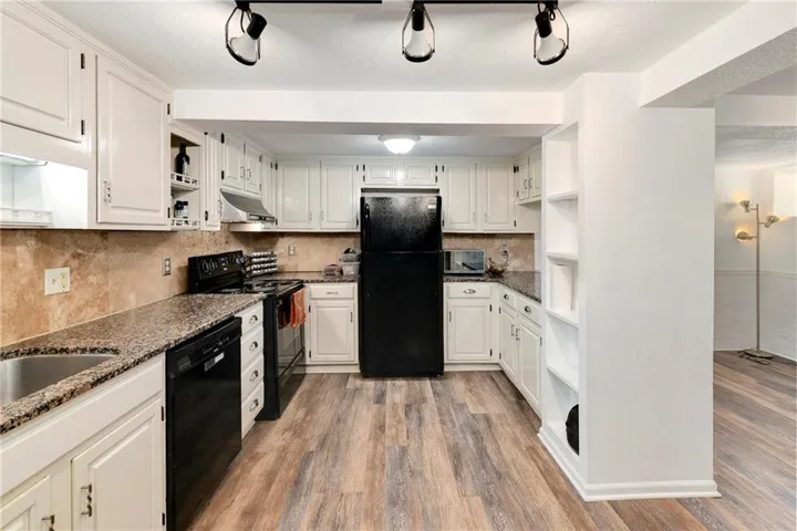 "LongDescription" => "Kitchen with ornamental molding, white cabinetry, stainless steel appliances, hanging light fixtures, and dark wood-style flooring"