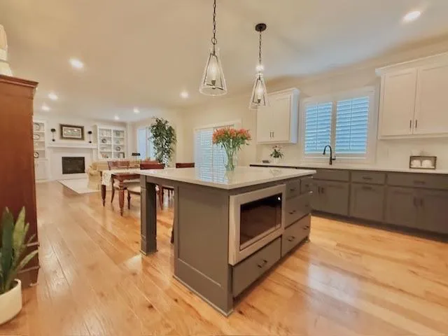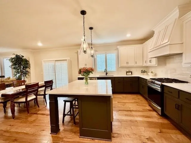 "LongDescription" => "Kitchen with green cabinets, open shelves, tasteful backsplash, and light stone countertops"