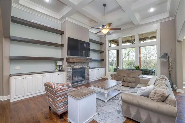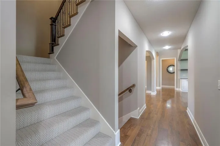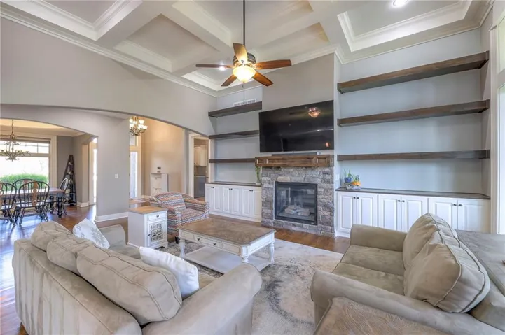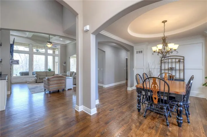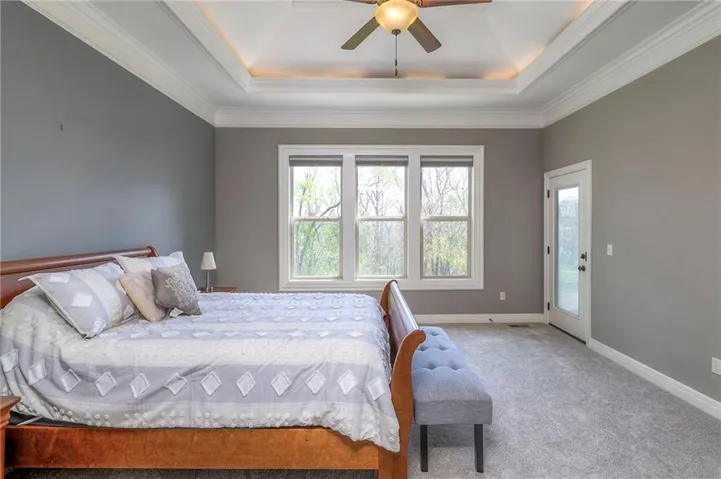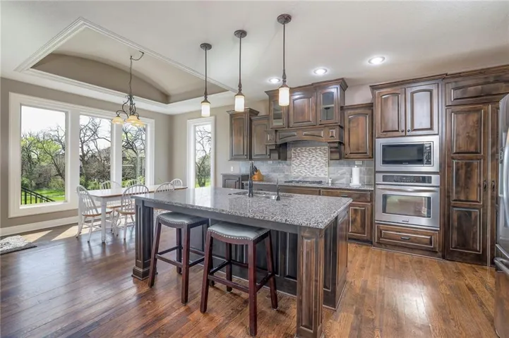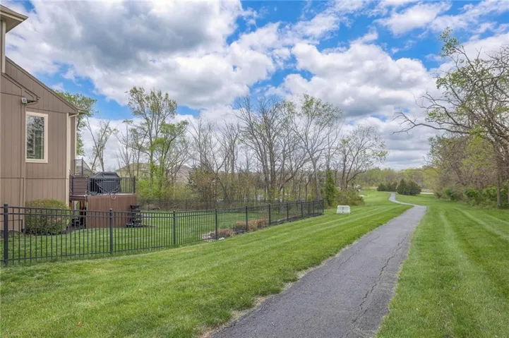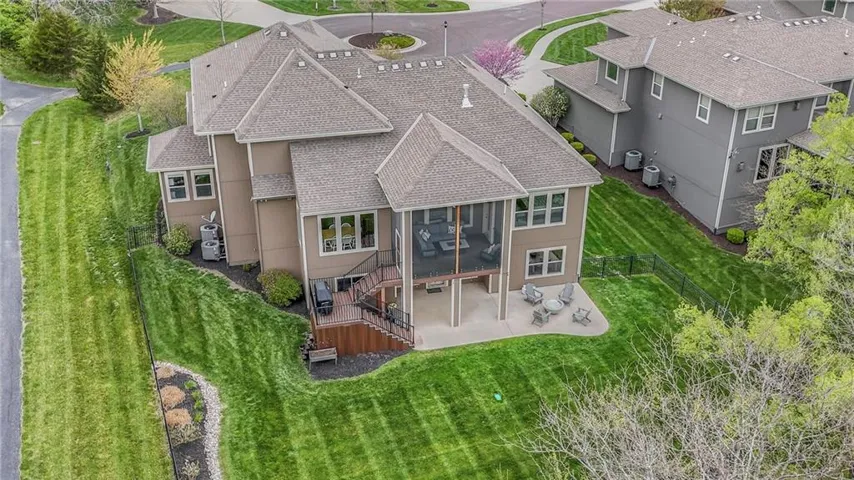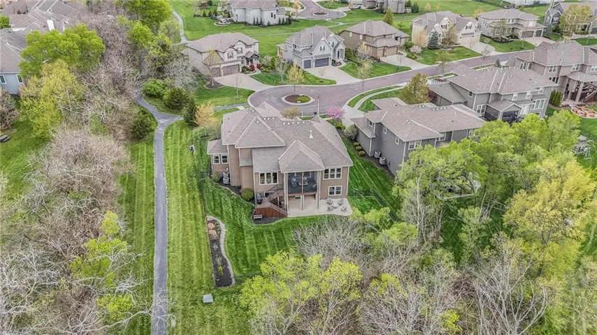 +"PublicRemarks": "Enjoy the spectacular water views from almost every room in this upgraded one-owner 1.5 story home with 2 bedrooms on the main level plus a tiered Media Room w/ 3 TV's or pull down screen. Where in Johnson County can you get all of this at this price!!?? The home has been well-cared-for and totally repainted throughout the inside with NEW carpet installed in April 2025. Large Grand Entry welcomes you into this open floor plan with curved archways. The Formal Dining Room has a circular raised ceiling plus wainscoting on the wall with a set-back for hutch or buffet. Great Room has recently been remodeled w/ stained shelving installed on both sides of the stone fireplace along w/ built-in cabinets. Don't forget to look up or you will miss the 9 boxed ceiling panels in the Great Room for your focus will be on the heavily treed green space & large pond w/ water feature! The chef's Kitchen has stained cabinets w/ upgraded granite countertops & lots of cabinets plus double ovens, stainless steel appliances, gas cooktop, AND a Butler's Pantry. Enjoy eating meals from the barreled ceiling Breakfast Room overlooking the fenced backyard, where you will find a screened-in deck with glass panels & ceiling fan w/ access to tiered grilling station. The primary bedroom also has access to the screened-in deck. The ensuite has a vaulted ceiling, dual shower heads, jetted tub & large walk-in closet plus private access to 1st floor laundry room (from primary bathroom or hallway). A second bedroom is also located on the main floor & is currently be used as an office w/ access to a 3/4 bath plus views of the green space heavily treed backyard. The second level has LARGE secondary bedrooms each w/ an enormous walk-in closets while the convenience of having a 2nd laundry room plus a LOFT! The lower level features the same upgrades w/ a massive wet bar, a beverage refrigerator, wine refrigerator & dishwasher plus a large Family & Rec Rm, 3/4 bath & 6th bedroom. This is truly a unique home"