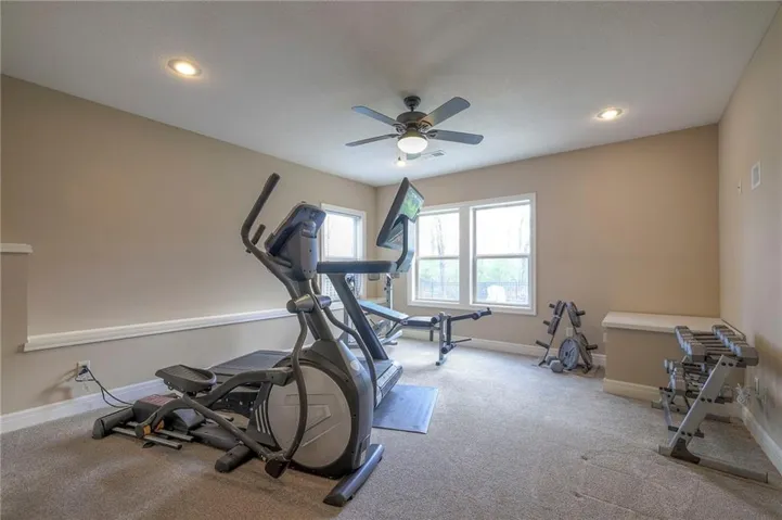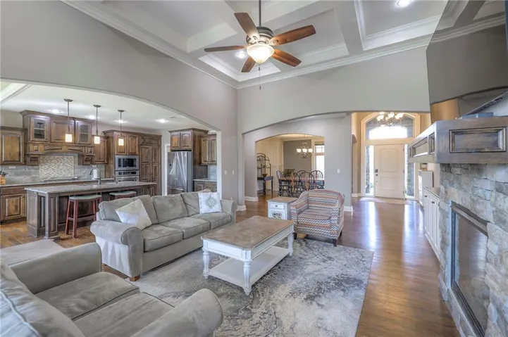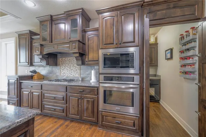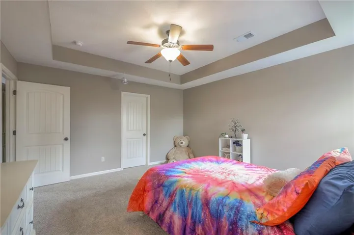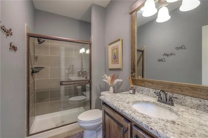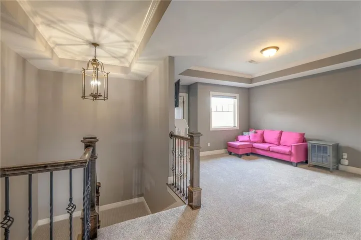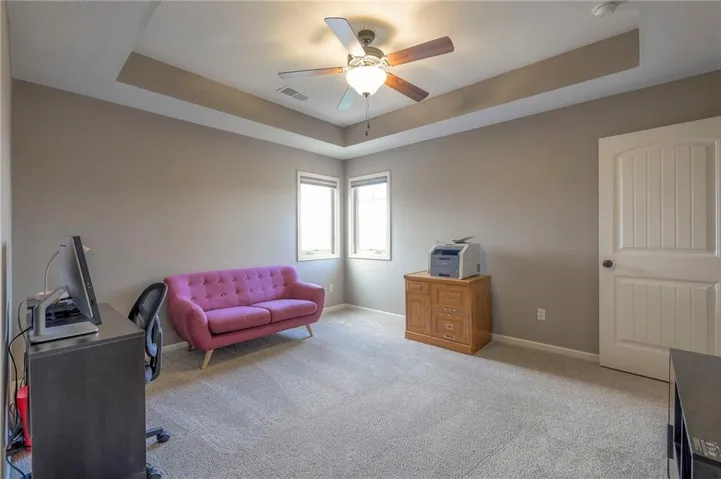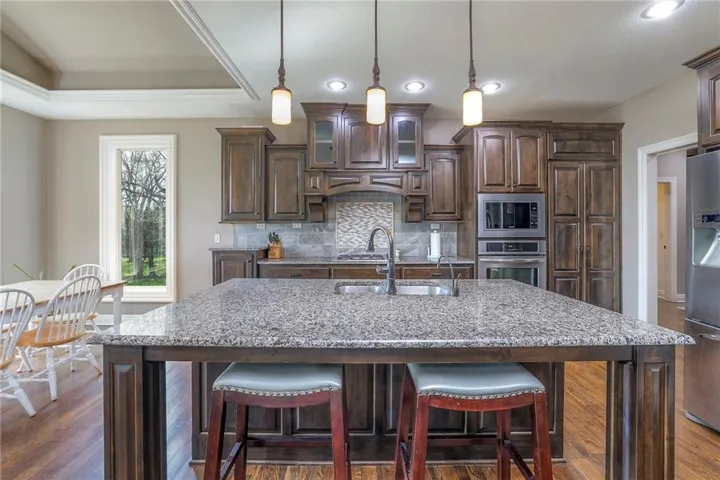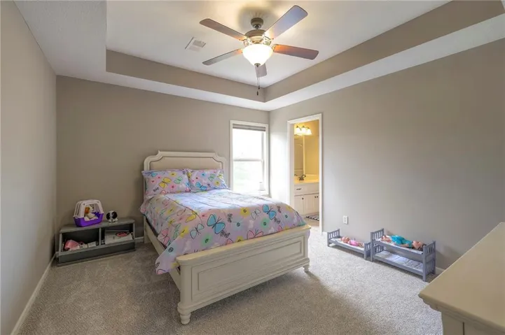 +"PublicRemarks": "Enjoy the spectacular water views from almost every room in this upgraded one-owner 1.5 story home with 2 bedrooms on the main level plus a tiered Media Room w/ 3 TV's or pull down screen. Where in Johnson County can you get all of this at this price!!?? The home has been well-cared-for and totally repainted throughout the inside with NEW carpet installed in April 2025. Large Grand Entry welcomes you into this open floor plan with curved archways. The Formal Dining Room has a circular raised ceiling plus wainscoting on the wall with a set-back for hutch or buffet. Great Room has recently been remodeled w/ stained shelving installed on both sides of the stone fireplace along w/ built-in cabinets. Don't forget to look up or you will miss the 9 boxed ceiling panels in the Great Room for your focus will be on the heavily treed green space & large pond w/ water feature! The chef's Kitchen has stained cabinets w/ upgraded granite countertops & lots of cabinets plus double ovens, stainless steel appliances, gas cooktop, AND a Butler's Pantry. Enjoy eating meals from the barreled ceiling Breakfast Room overlooking the fenced backyard, where you will find a screened-in deck with glass panels & ceiling fan w/ access to tiered grilling station. The primary bedroom also has access to the screened-in deck. The ensuite has a vaulted ceiling, dual shower heads, jetted tub & large walk-in closet plus private access to 1st floor laundry room (from primary bathroom or hallway). A second bedroom is also located on the main floor & is currently be used as an office w/ access to a 3/4 bath plus views of the green space heavily treed backyard. The second level has LARGE secondary bedrooms each w/ an enormous walk-in closets while the convenience of having a 2nd laundry room plus a LOFT! The lower level features the same upgrades w/ a massive wet bar, a beverage refrigerator, wine refrigerator & dishwasher plus a large Family & Rec Rm, 3/4 bath & 6th bedroom. This is truly a unique home"