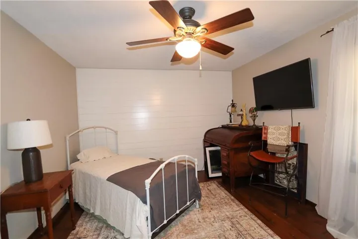 "LongDescription" => "Bedroom with wood walls, wooden ceiling, dark wood-style floors, a wainscoted wall, and ceiling fan"