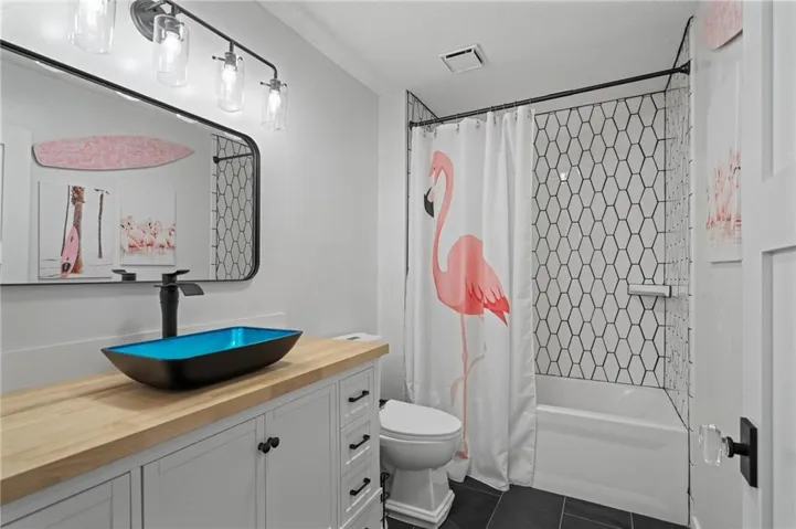"LongDescription" => "Full bath featuring a shower with shower curtain, backsplash, vanity, and wood-style floors"