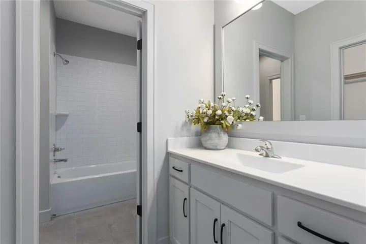 "LongDescription" => "Bathroom with vanity, dark wood-type flooring, recessed lighting, and washtub / shower combination"