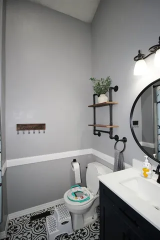 "LongDescription" => "Half bath featuring vanity and dark wood-style flooring"