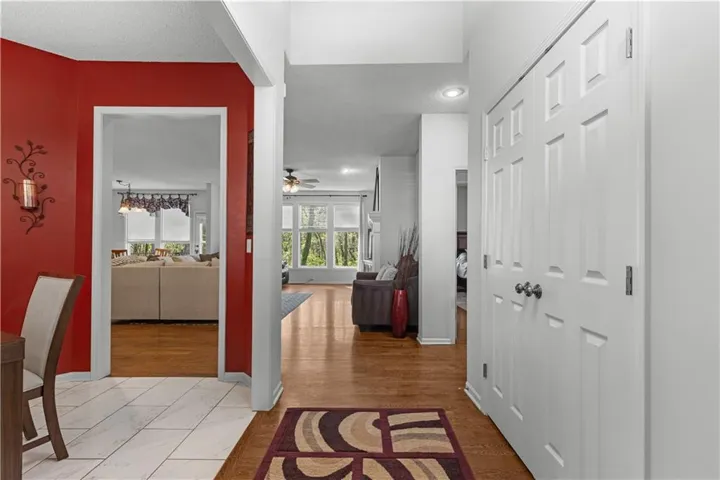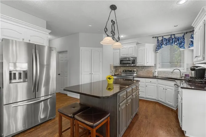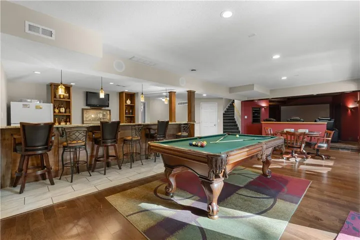 +"PublicRemarks": "Tucked away on a quiet cul-de-sac, this stunning 1.5-story home offers privacy and peaceful wooded views from a beautifully fenced backyard with both a deck and patio—perfect for outdoor living. Inside, an open layout showcases a spacious island kitchen with granite countertops, stainless steel appliances, and hardwood floors that flow into the great room with a cozy fireplace. The main floor also features a formal dining room and a luxurious master suite with hardwood floors and a spa-like bathroom including a Jacuzzi tub and separate shower. Upstairs, you’ll find three generous bedrooms, a versatile office space, and a smart, functional layout. The walkout lower level is built for entertaining, complete with a full bar, rec room, and theatre. With a three-car garage, newer roof and deck, and updates throughout, this home offers comfort, style, and space in a serene setting."