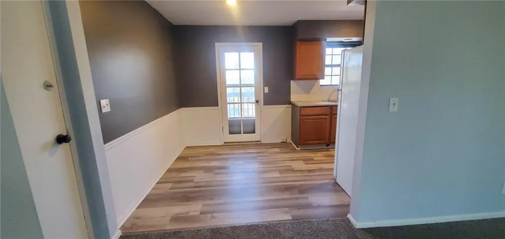 "LongDescription" => "Kitchen with white appliances, wood finish cabinetry, stacked washer and dryer, and dark wood finished floors"