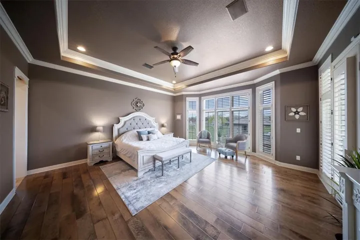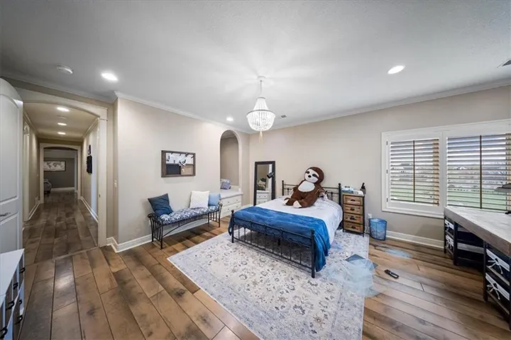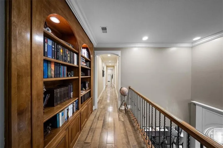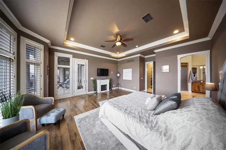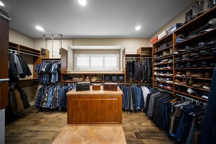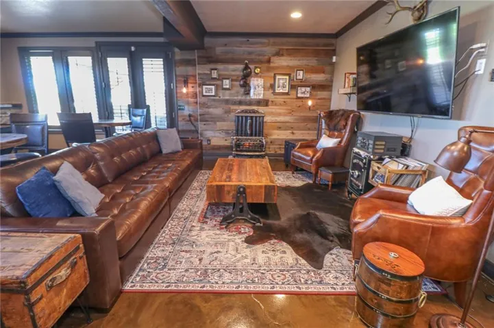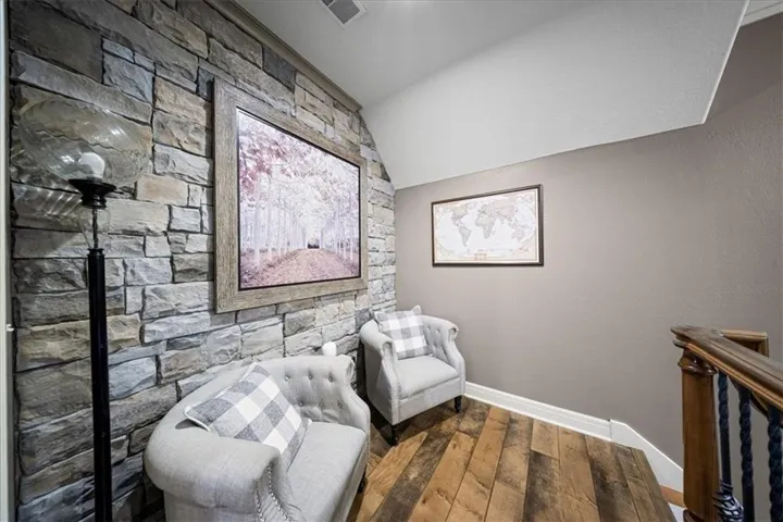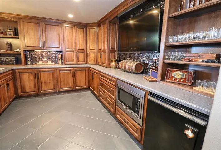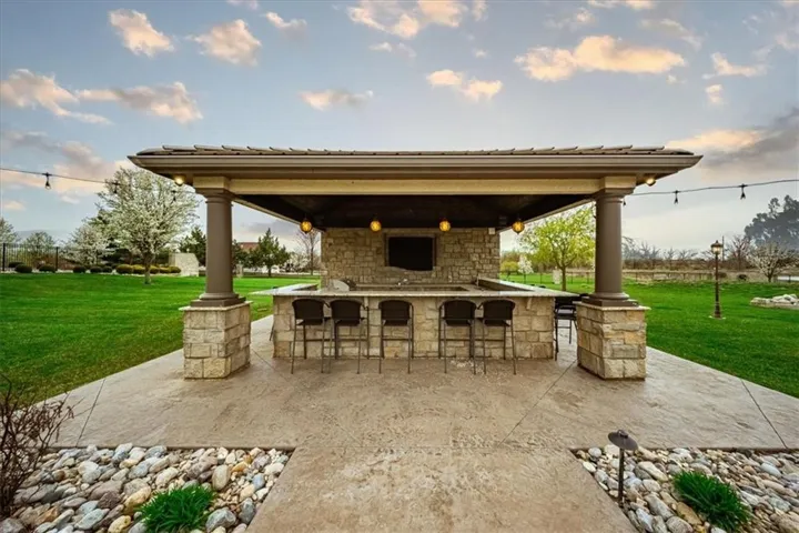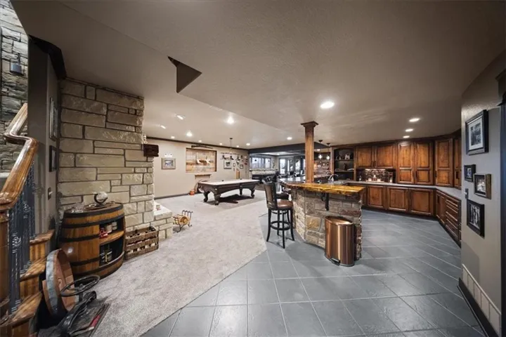 A majestic bar area lounge, anchored by a beautifully hand-carved bar top. Family rooms feature new plantation shutters, updated lighting, striking stone and wood accent walls, walk-out access to a covered patio. Theater room (4th bedroom) reclining seats that remain with the home. A 5th bedroom offers exceptional built-in storage. \r\n