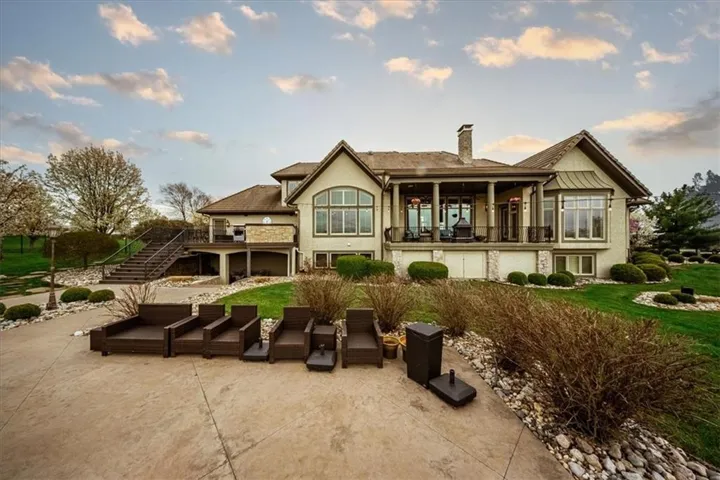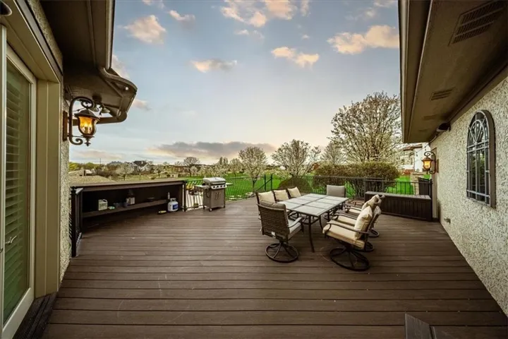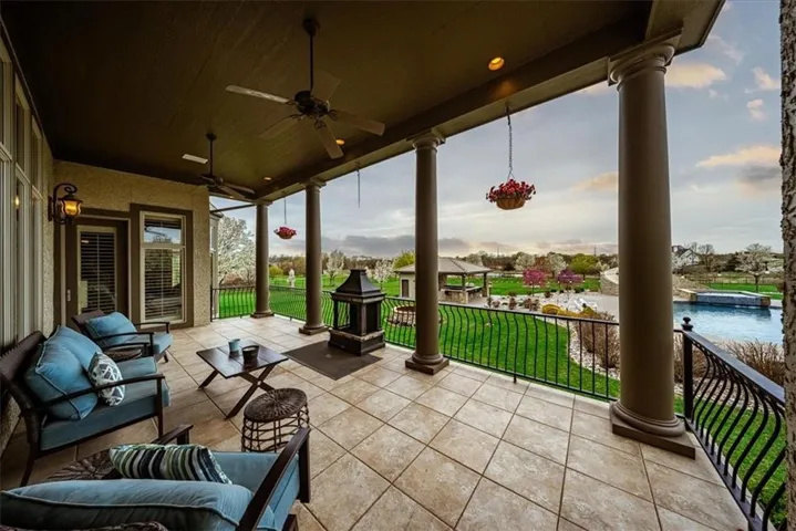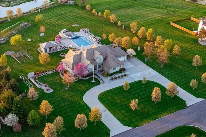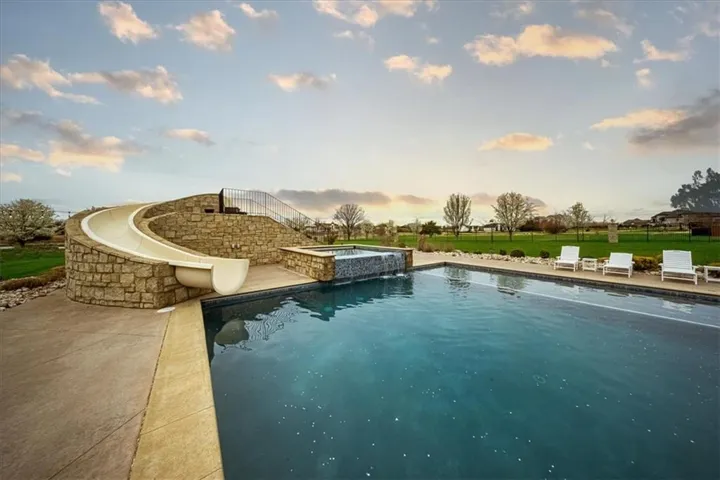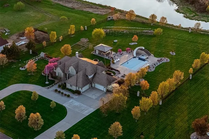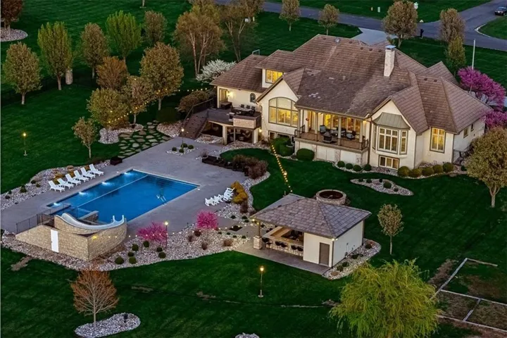 Private terraces with breathtaking sunset views overlooking your sparkling saltwater pool and a pond. The pool boasts a slide & hot tub. Updated pool house with a bar and bath. *Some pool furniture stays (white lounge chairs around the expansive deck). Host unforgettable fall evenings around the firepit within the secure fenced metal gate with remote access. 4-car oversized garages provide potential space for five vehicles or extra toys.