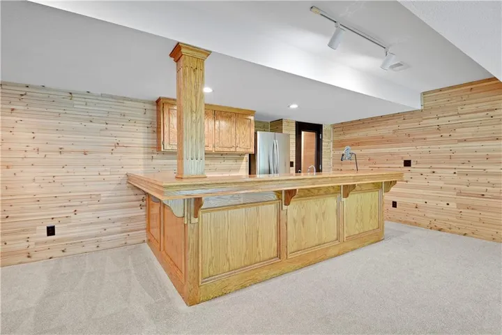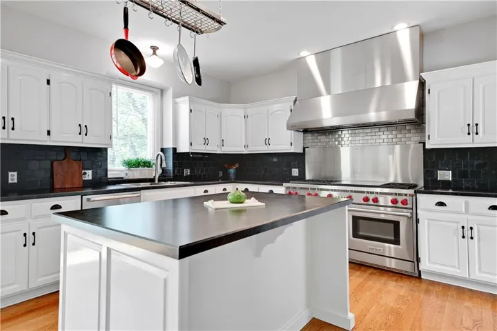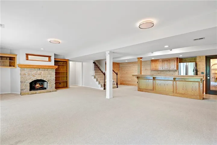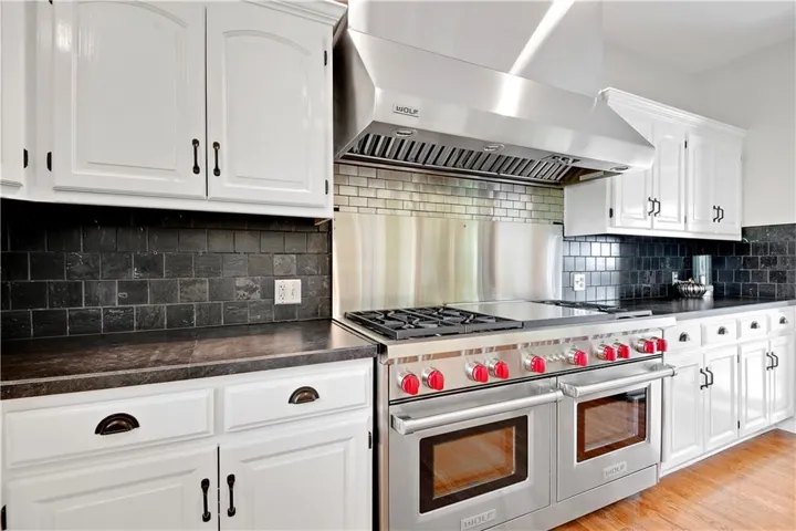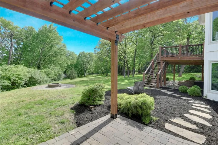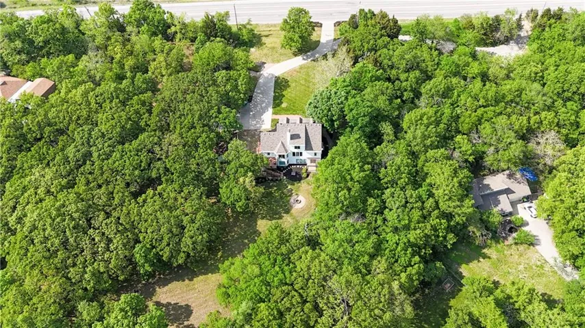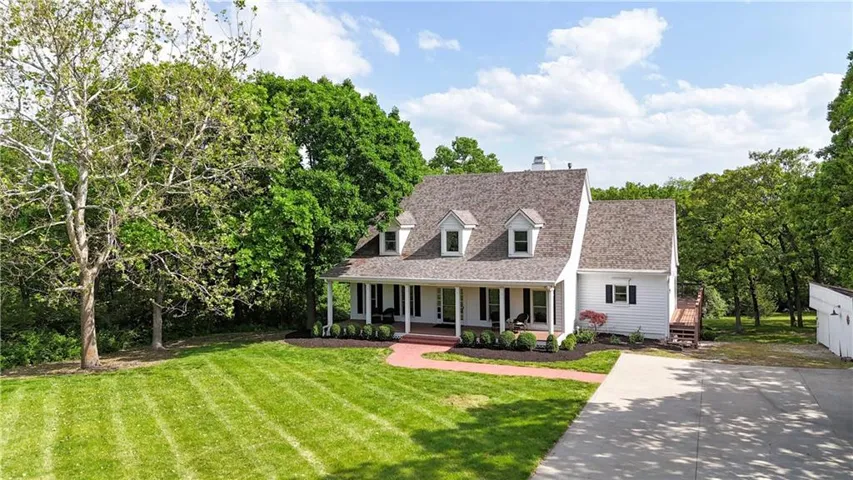 County Living on 4+ Acres only minutes from Lenexa City Center! 1.5 Story Colonial Home with detached 3 car garage and several out buildings that can be whatever you choose, love fresh eggs raise chickens. The choice is yours. As you enter the property be aware there are 2 driveways. Main drive and an alternate blacktop driveway. Huge covered front porch with room for a swing and seating. Inside the house is a dining room to the right with hardwoods, lovely staircase to the 3 bedrooms upstairs and a bonus room. Primary bedroom on main floor is spacious with fresh and bright en-suite white bathroom. Living Room has carpet and a see-through fireplace to Hearth Room. Hardwoods in Hearth Room and Kitchen. Kitchen is a cooks dream with a Commercial Wolf Range, you will love creating amazing breakfast treats on the griddle. Utility room with storage and exit to the deck. Finished Lower Level with Bedroom and Bath, Rec Room, Wet Bar and Wine Cellar. \r\n