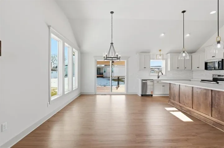 +"PublicRemarks": "**Home is complete** BRAND NEW construction home with main level living. This 4 bed/3 bath won't disappoint with high vaulted ceilings, custom cabinetry, luxury vinyl plank floors, over-sized Kitchen island, granite counter tops thru-out, HUGE walk-in tile shower in Master bathroom & large main floor laundry room! 2nd Family Room, 4th bedroom & full bath on lower level. 3 car garage! Other home features include: high efficiency hvac system, electric fireplace, passive radon system, stairs off the covered, deck onto a concrete patio! Composite decking - no future maintenance! 1 year builder warranty!"