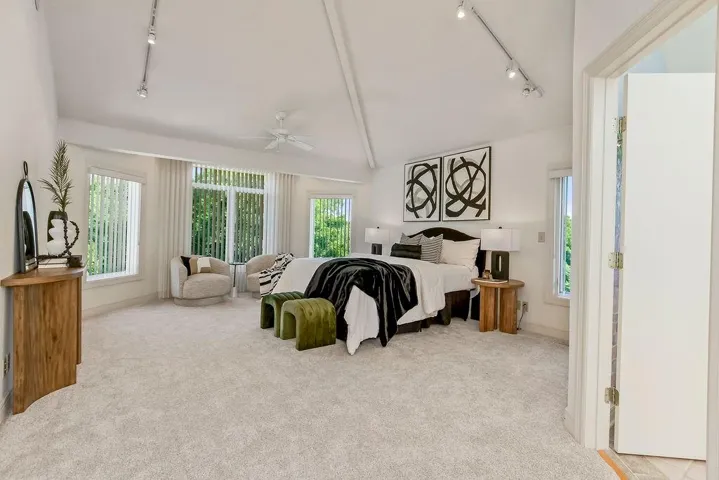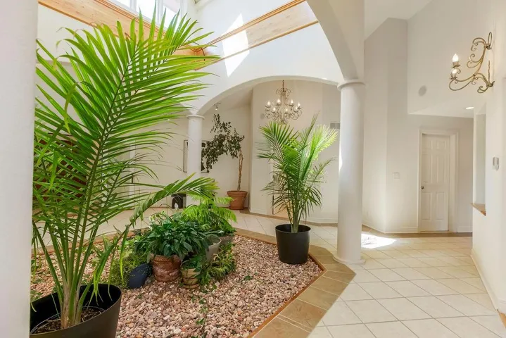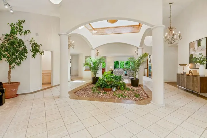 Inside, the home boasts an inviting open-concept design accentuated by soaring ceilings, exposed wood beams, and hand-selected, meticulously maintained finishes. A double French door entry opens to a dramatic two-story atrium with a tiled floor and a light, neutral color palette that flows throughout. Floor-to-ceiling windows flood the space with natural light and offer breathtaking views of the beauty outside.\r\n