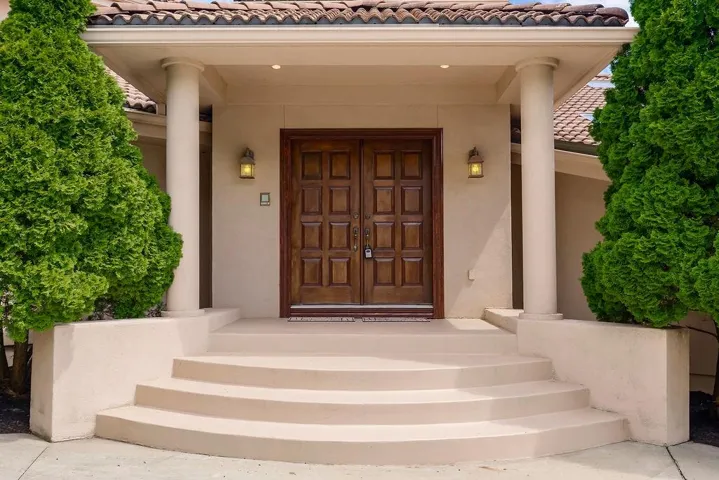 Prepare to be captivated by this custom-built, Spanish-inspired Reverse 1.5 Story home, perfectly situated on a premier walk-out lot. Upon arrival, the classic stucco exterior, striking concrete tile roof, and rich wooden accents immediately define its timeless Mediterranean character.\r\n