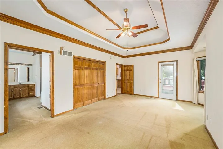 +"PublicRemarks": "2.5 ACRES, HOLMES CREEK, KEARNEY SCHOOLS, 36X54 OUTBUILDING w/RV DOORS, SHARED POND, MATURE TREES, REVERSE 1.5!! HIGHLY MOTIVATED SELLER, BRING US AN OFFER!! Bring your vision and make this your own! GORGEOUS TREED LOT that shares a LARGE POND w/ neighbors. RELAX ON THE DECK & TAKE IN THE VIEWS! 3 car garage on main w/4th on LL. The SPACIOUS MAIN LEVEL features great room w/BEAMED CEILING, BRICK FIREPLACE & lots of windows for NATURAL LIGHT along w/ formal dining room or office. Kitchen features LOADS OF CUSTOM CABINETS, island, pantry, GAS COOKTOP, eating space and more! MAIN LEVEL PRIMARY ENSUITE has 2 closets, jetted tub, double vanity & separate shower. 2 secondary bedrooms, 2nd bath & laundry also on the main for convenience. LL is partially finished w/full bath & rec room area. SO MUCH SPACE to finish to your liking or use for storage. New roof in 2020. HURRY!!"