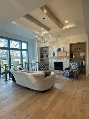 Great Room: Box-beamed ceiling, floor-to-ceiling tile fireplace, wall of windows!\r\n