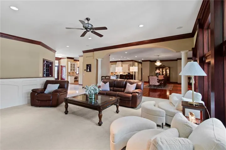 +"PublicRemarks": "Home sits on a picturesque and private 40 acres! This one of a kind property is breathtaking and features a sprawling all brick ranch that is rich with features and a well thought out floor plan. It’s got it all! Enjoy your own sanctuary with nary a neighbor, but still close to Liberty and Kearney. (Kearney Address, Liberty Schools.) Gated entrance with video comms, long paved driveway to the house and 40x60 outbuilding. Enormous Kitchen with custom cabinets and a spacious butler’s pantry. Large Dining area off of Kitchen and looks into the Living Room. 2 Bedrooms on the back of the house, each with their own full bath. The Master Suite is amazing! Including a breezeway to the in-ground and enclosed hot tub room with a fireplace. Sunroom has a half bath for pool guests and a wet bar. The pool deck is off the sunroom and on the same level as the main floor. The study is located off the entry to the home, and has a fireplace and a secret door! Both ends of the basement walkout. One end is the entrance to the massive suspended garage with 3 garage doors, (4 car garage main level!). There’s so much room down there! The other end walks out to a large patio and garden. Inside is a full bar, rec room and living room with fireplace. Basement also has two workout rooms and a sauna. It’s also home to the fourth bedroom with a full bath as well. Lots of unfinished space and storage in the basement, so there’s room to repurpose it however you’d like. This is a “see it to believe it” type of property!"