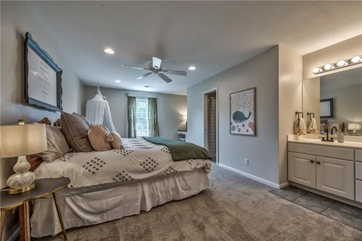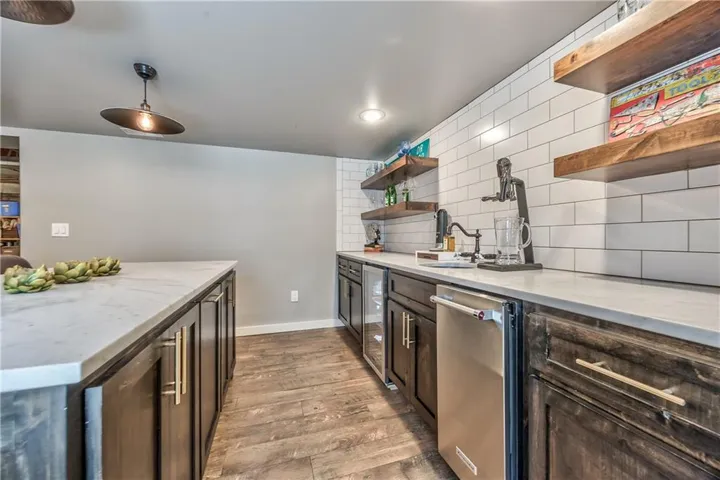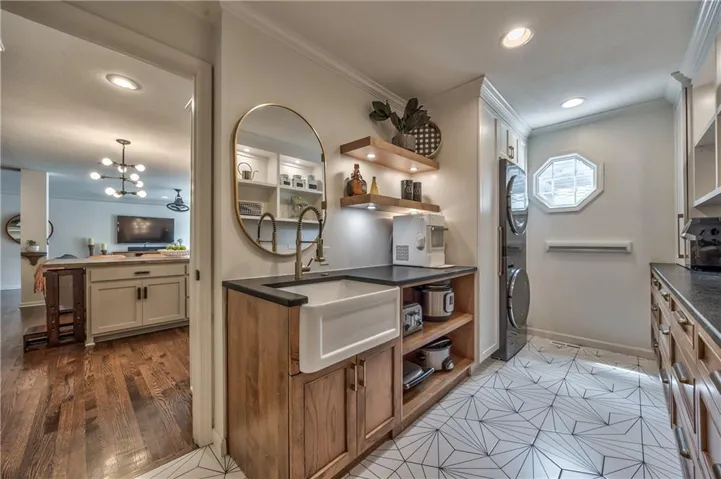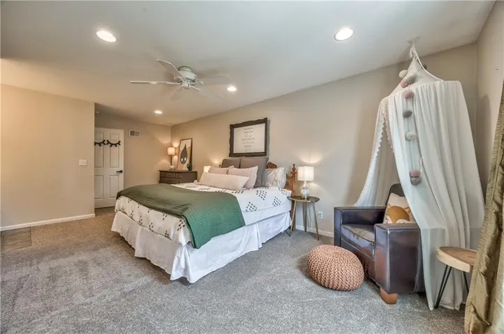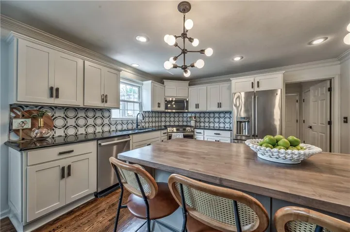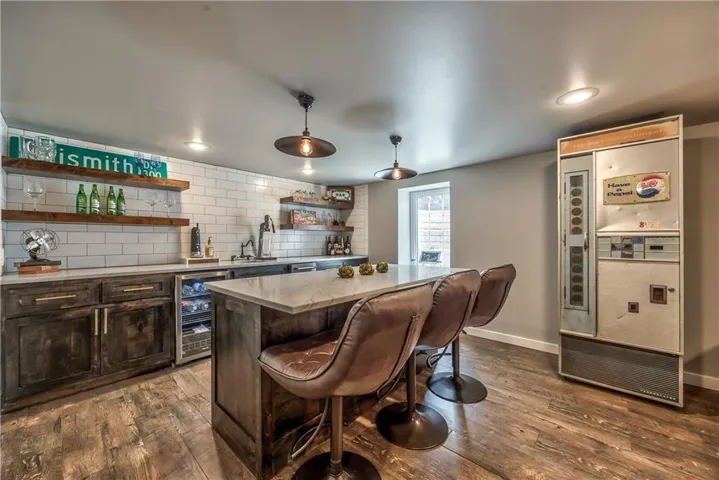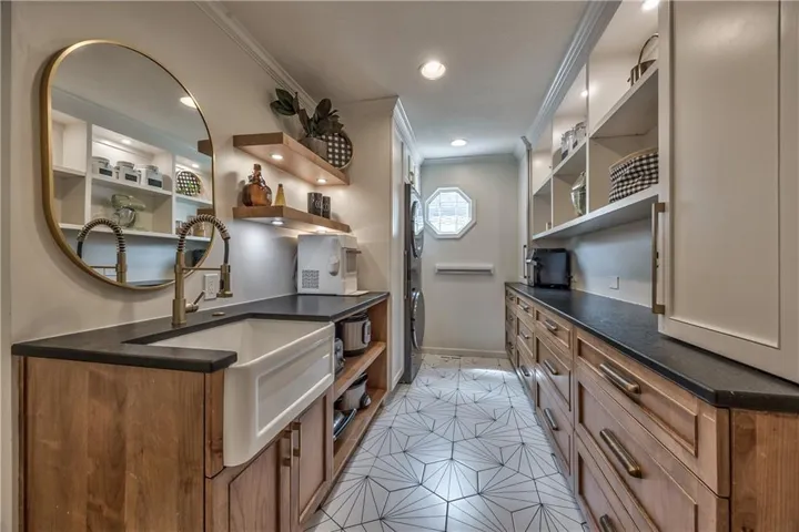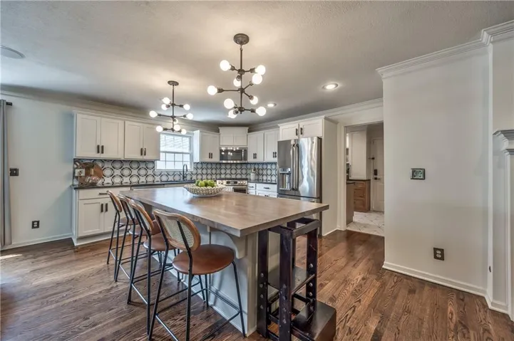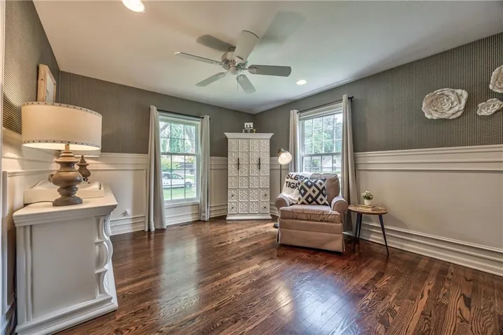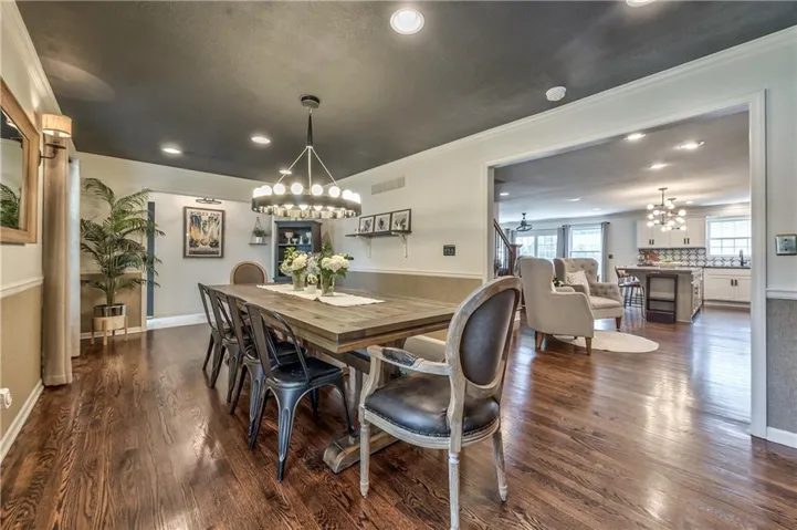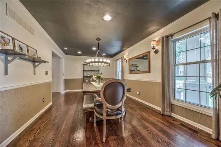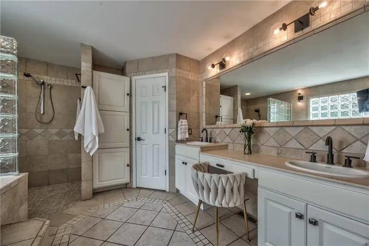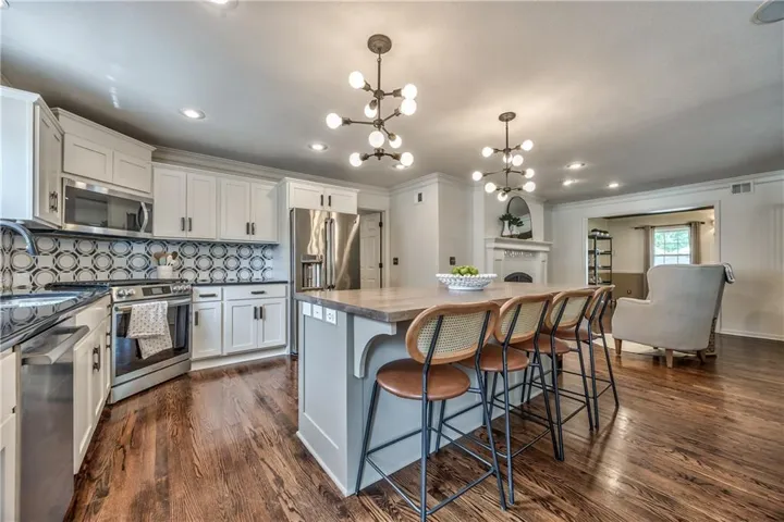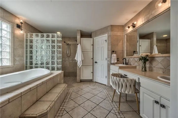 +"PublicRemarks": "Prepare to be absolutely captivated the moment you turn onto Cherokee Lane—one of the most idyllic & tree-lined streets in all of Old Leawood. Towering, mature trees & timeless charm create a storybook setting for this exceptional home. This home welcomes you with a stately portico & pristine, low-maintenance landscaping framed by clean concrete edging. A true rarity in the area, this property features a 4-car garage offering ample space for storage, hobbies, or workshop but with extra-high ceiling it's ideal for a golf simulator or home gym. Stepping into the marble-tiled entryway, discover a floor plan designed for entertaining & comfort. Formal dining room is perfect for hosting, & flows seamlessly to the living room anchored by a cozy hearth. Adjoining kitchen is both stylish & functional, with fresh paint throughout, handcrafted custom cabinetry, & a stunning, custom-made island countertop. True butler’s pantry/mudroom includes heated floors, a stackable washer & dryer, and direct access to the rear garage. Throughout the main level, enjoy the warmth & elegance of hardwood floors-including in the bedrooms. Main floor primary suite offers a tranquil retreat with spacious walk-in closet & luxurious private bath complete with jetted tub & zero-entry walk-in shower. Upstairs, 2 additional bedrooms & a versatile loft, all with brand-new carpeting. Each bedroom has a walk-in closet, built-in desk & private vanity, with a shared Jack-and-Jill bathroom. Large basement offers ample storage along with a generously sized finished area complete with a stylish speakeasy-inspired bar. Convenient secondary staircase provides direct access to the garage. Home includes zoned HVAC system with a damper setup for enhanced climate control. Sprinkler system covers all whole yard & landscaped areas. Expansive backyard features a beautifully designed stamped concrete patio to mimic the look of brick pavers—ideal for outdoor dining, entertaining, or quiet evenings at home."