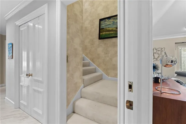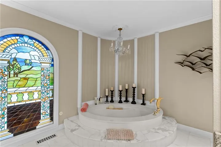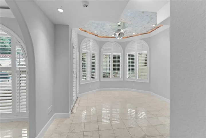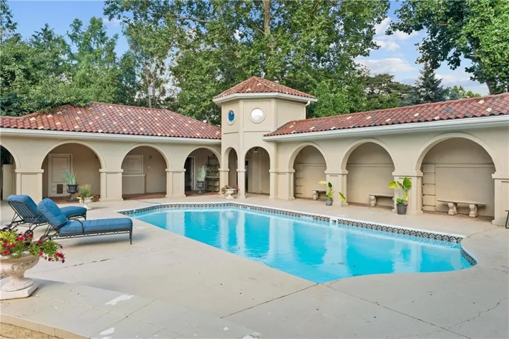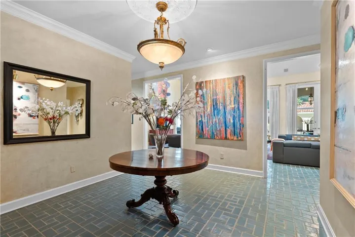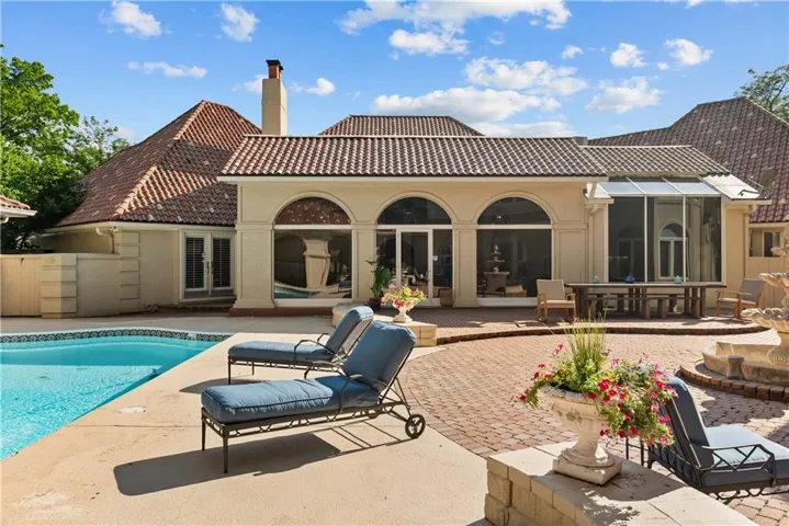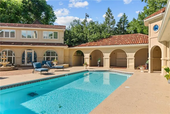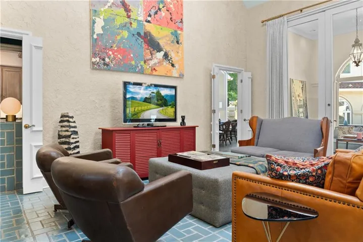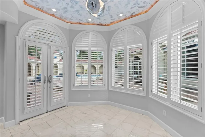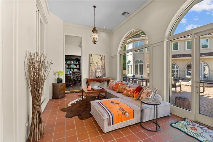 Elegant 10-foot French doors open to a sunroom that leads to the heart of the home: a secluded Mediterranean-style courtyard. This private outdoor oasis features graceful arches, lush landscaping, and a sparkling pool—perfect for relaxing or entertaining in total privacy.\r\n