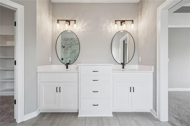 freestanding soaking tub, tiled shower with heavy-duty glass surround, dual vanities,\r\n