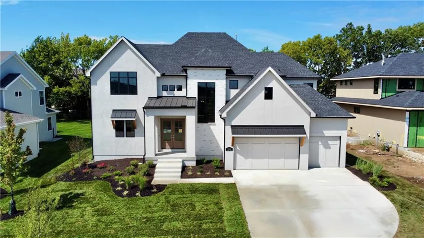 "LongDescription" => "Prairie-style home with stone siding, driveway, a garage, stucco siding, and a shingled roof"