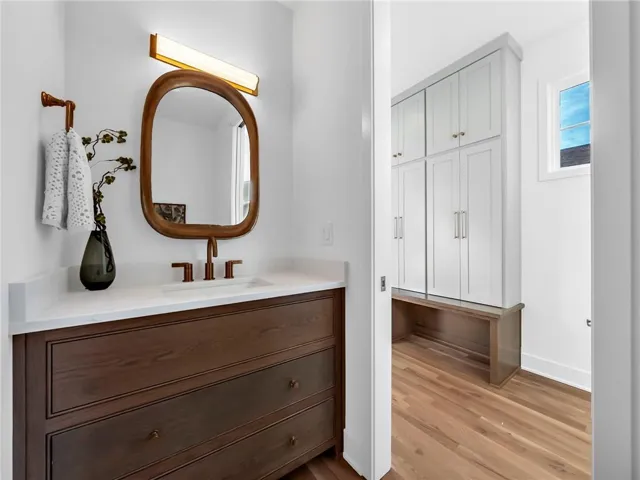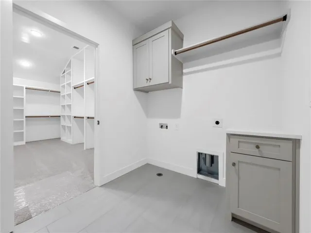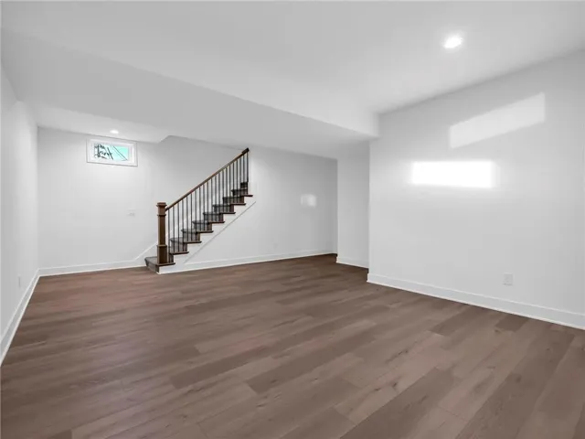 The eye-catching exterior features an arched front door with a custom layered brick surround, acrylic stucco, black windows, a curved roofline, and shutters. This custom-designed two-story home by Chris George Custom Homes offers hardwood floors throughout the main level, a convenient mudroom/drop zone off the garage, an open kitchen with an oversized island and walk-in pantry and a spacious dining area. The living room includes a fireplace and dry bar—ideal for entertaining. Upstairs, generously sized secondary bedrooms with vaulted ceilings offer ample space. A private home office at the rear of the home can also serve as a fifth non-conforming bedroom, playroom, or nursery. The primary suite features vaulted ceilings, a spacious 260 sq. ft. bedroom and a massive 166 sq. ft. walk-in closet. The laundry room connects directly to the primary closet and hallway for optimal convenience. The finished lower level includes a fourth bedroom, full bathroom, and secondary living space, with plumbing ready for a future wet bar. Notable Features include 36" gas range with custom cabinet hood, ceiling-height cabinetry with soft-close drawers, solid core interior doors, 8' tall doors on the main level, custom trim details, inset hardwood floor vents, LVP flooring in the lower level, battery backup sump pump, sprinkler system and more.