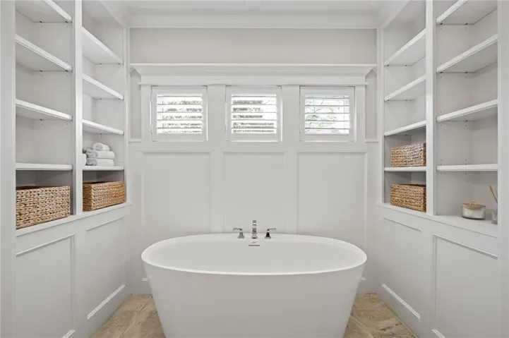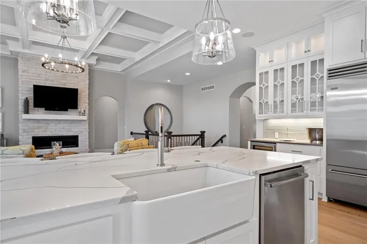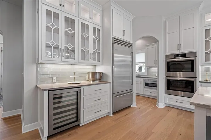 The chef’s kitchen is a dream with professional grade appliances: Wolf range top and vent hood, built-in dual-compressor refrigerator/freezer, Bosch dishwasher, double ovens, farm sink with new pull-down sprayer faucet, a prep kitchen, huge pantry, wine cooler, and a drawer-style microwave (1 year old).\r\n