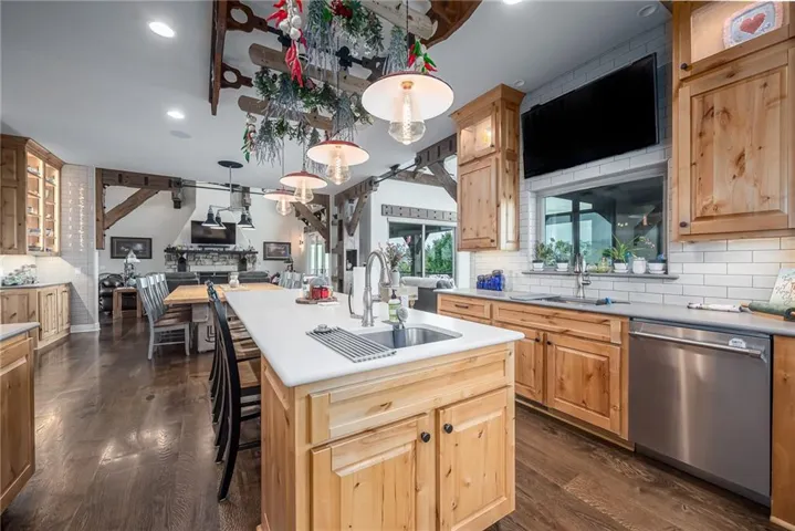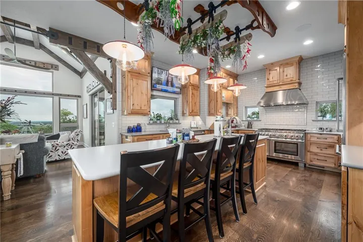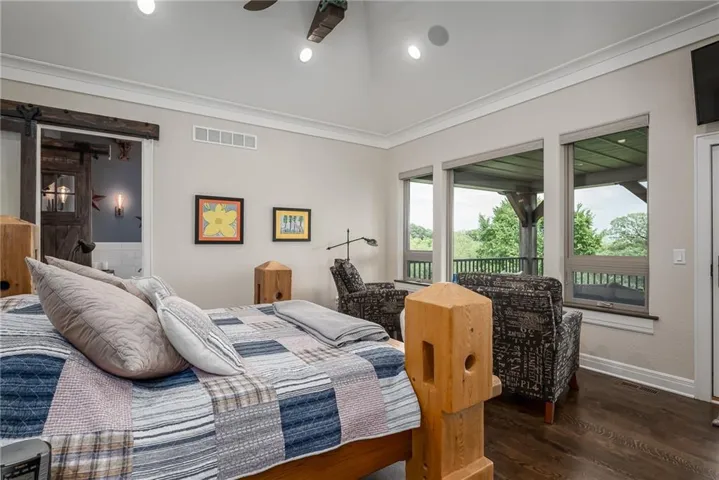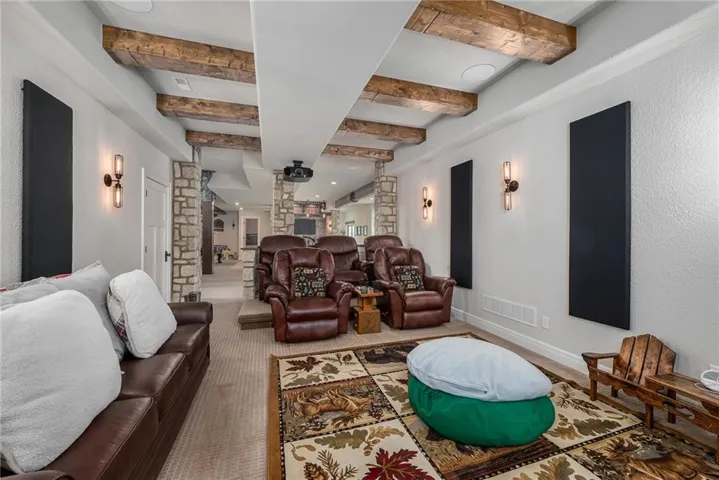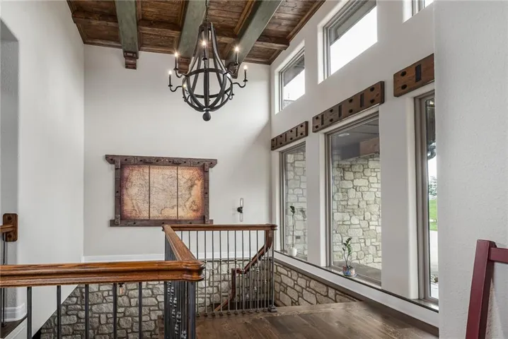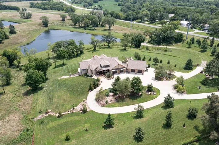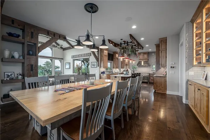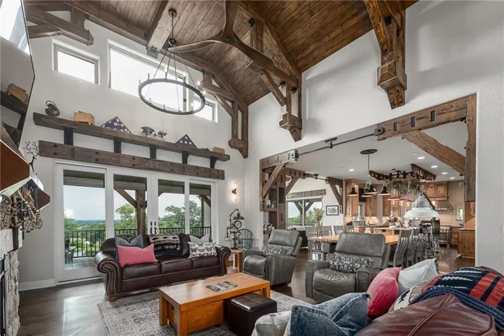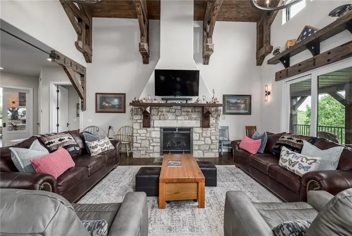 +"PublicRemarks": "NO EXPENSE SPARED IN THIS LUXURIOUS ESTATE HOME ON 10.16 ACRES WITH BREATHTAKING VIEWS! This 3-bedroom, 3 full and 2 half bath masterpiece combines craftsmanship and elegance with custom wood beams, wide oak plank floors, and soaring 10-foot ceilings on both the main and basement levels. The chef’s kitchen boasts a large pantry, island, custom Ceasar stone counters, and premium Thermador appliances. The vaulted sunroom is perfect for formal dining, while the great room impresses with massive beamed ceilings and a cozy fireplace. The master suite is a true retreat with custom ceiling beams, a huge walk-in closet, and a spa-worthy bath featuring double vanities, jetted soaking tub, and custom rain shower. An office with fireplace can serve as a 4th bedroom. The finished basement is designed for entertaining, offering a family room with stone wet bar, rec area, media room, two bedroom suites, and an exercise room that can be another bedroom. Built with 2x6 construction and spray foam insulation, this home includes 2 geothermal HVAC units, audio-visual components, sound and heating in the 4-car garage, and a gated entry with custom iron fencing. Just outside city limits, this estate delivers privacy, high-end amenities, and incredible sunrise views!"
