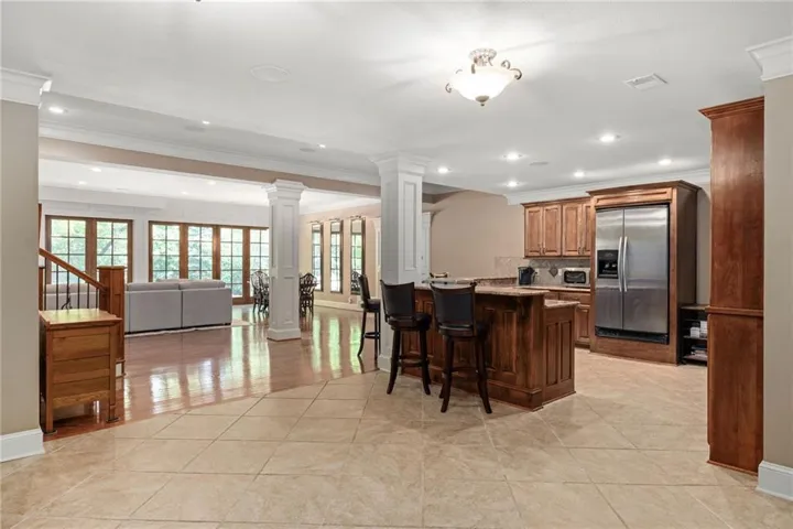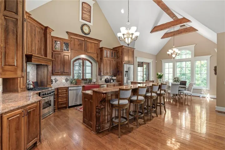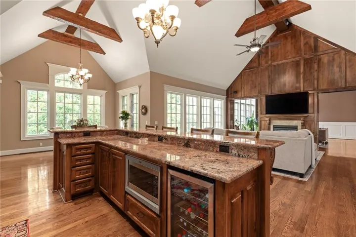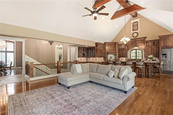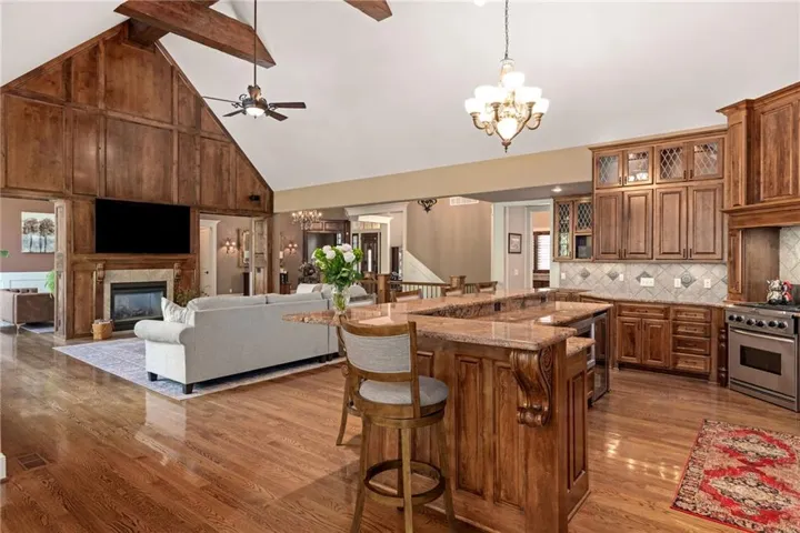 Experience the height of luxury living in this stunning custom-built home nestled in the heart of Leawood. With rich hardwood and marble floors throughout, this reverse 1.5-story residence blends timeless sophistication with modern design. The open-concept layout welcomes you with soaring ceilings, custom cabinetry and woodwork, and abundant natural light—perfect for both grand entertaining and everyday living. At the heart of the home, the chef’s kitchen boasts top-of-the-line appliances, a gas range, and a beautifully functional design made for both cooking and gathering.\r\n