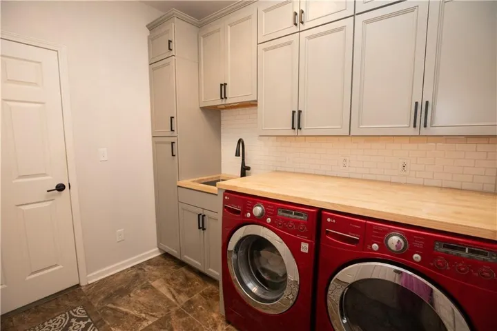 "LongDescription" => "Laundry room featuring wood walls, washing machine and dryer, and heating unit"