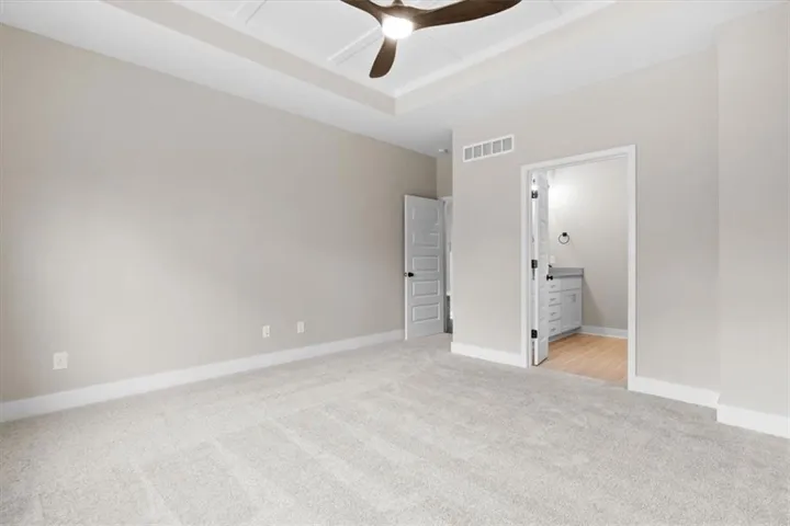 "LongDescription" => "Empty room with ceiling fan, carpet floors, lofted ceiling, plenty of natural light, and french doors"
