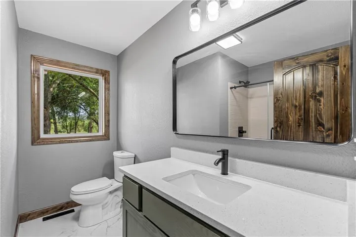 Rich stained wood doors and trim, new windows for improved efficiency, and stylish finishes carry throughout the home. The full bathroom is outfitted with an Onyx walk-in shower and matching quartz counters for a sleek, low-maintenance design, while marble-appearance flooring in the bathrooms and utility room adds a touch of elegance.\r\n