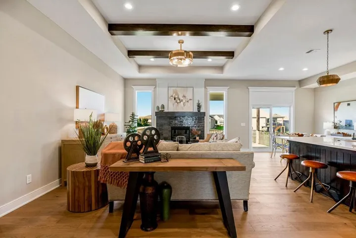 +"PublicRemarks": "JFE Construction brings their fabulous Bayberry Rev. 1.5 sty plan to Johnson Counties newest maintenance provided community of Prairie Canyon! This beauty sits on a walkout lot with SE rear exposure backing to greenspace w/dramatic long vistas! Cathedral vaulted ceilings in the entry, Great rm & thru to the covered deck with FP. Open concept plan with Great rm., kitchen & dining all open to each other, large island & spacious pantry. Two bdrms & 2 baths on the main floor, 2 bdrms. & 1 bath down with plenty of Family & recreation space which includes a fantastic wet bar!"