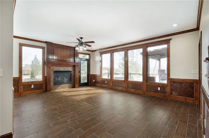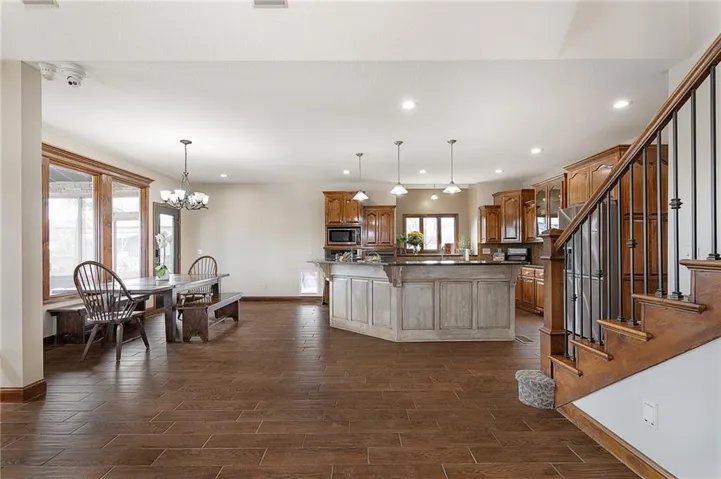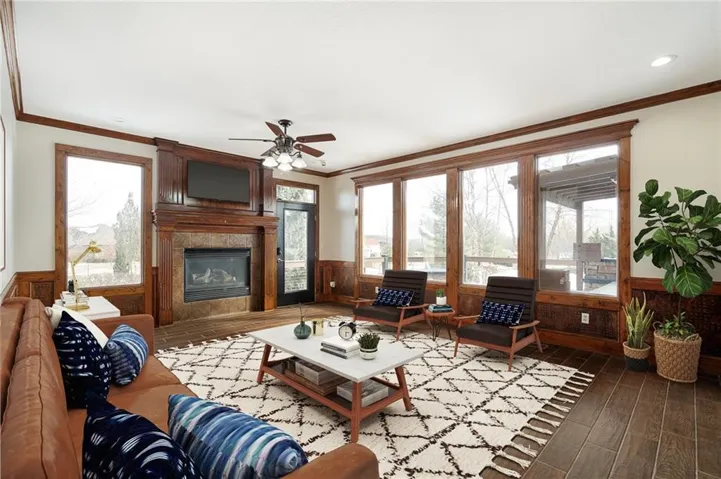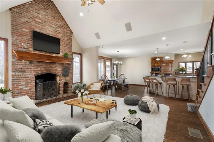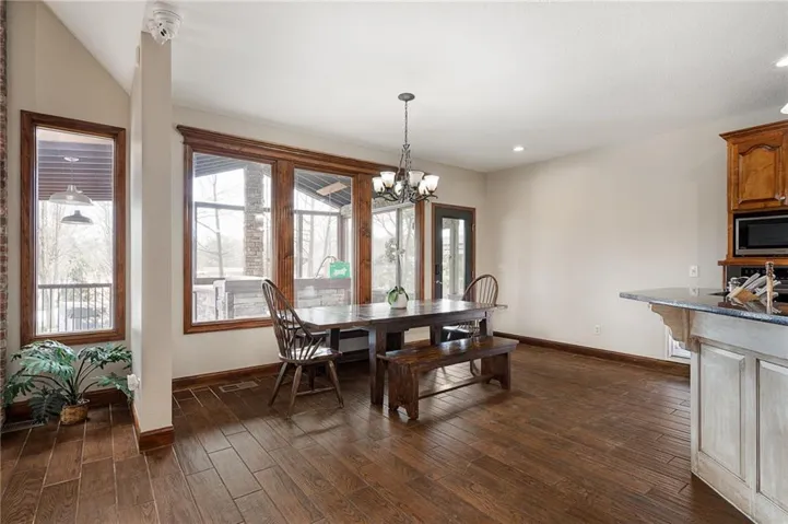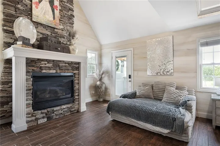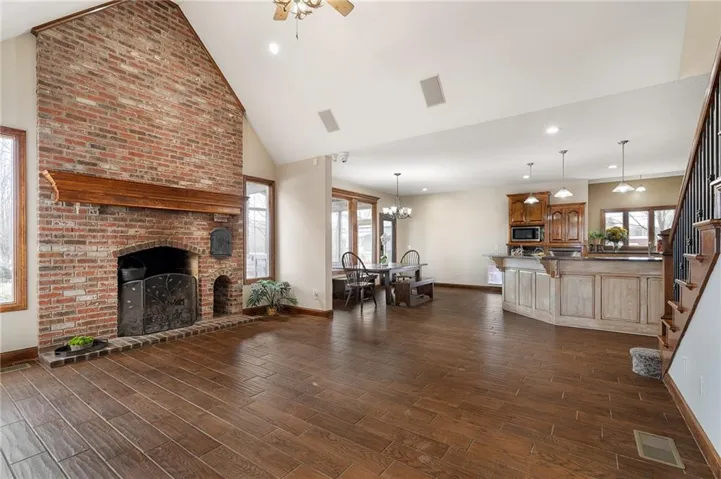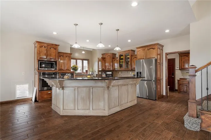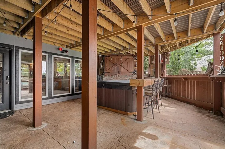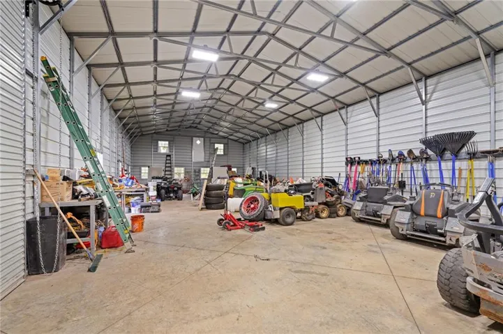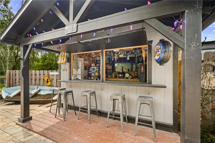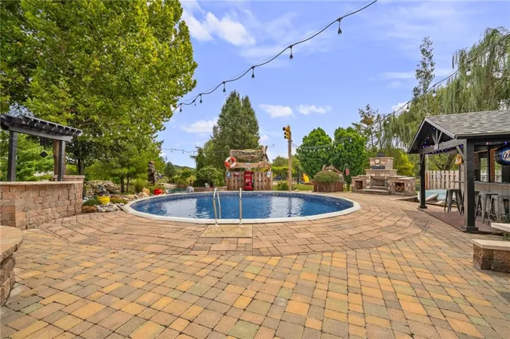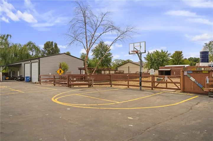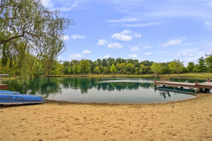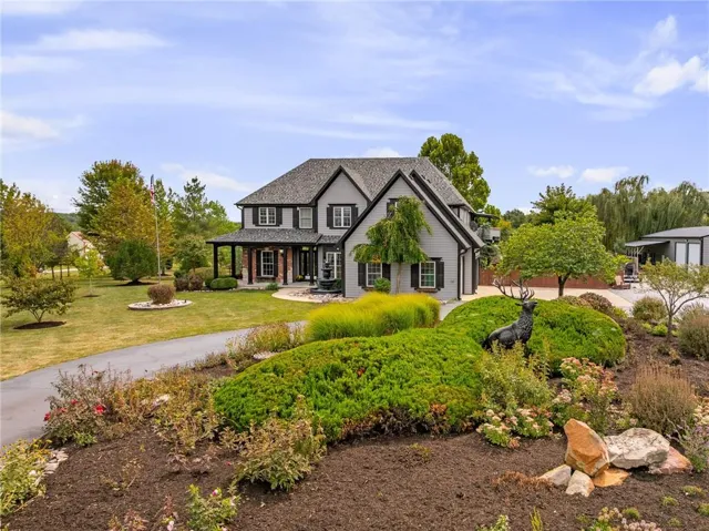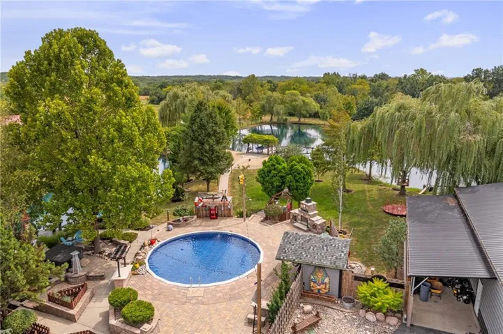 +"PublicRemarks": "Live, work, and play like never before on this fully fenced, gated 5-acre estate on blacktop in Lone Jack—designed for entertaining, outdoor living, and enjoying the land your way. Whether you're into fishing, paddleboarding, raising chickens, gardening, hosting parties, or running a business from home, this unique property makes it possible. Three scenic ponds set the stage—one with sandy beach, dock, playhouse with hurricane deck, and zip line; another with a 12-foot stone waterfall framed by weeping willows. Outdoor living includes a pool, festive bar, outdoor shower, firepits, fountains, basketball court, and striped parking for nine. A vintage merry-go-round, playground, and wisteria-draped pergola add whimsy, while mature landscaping and unique trees create a lush, park-like setting. Grow and raise what you love: a fenced livestock area with shelters and duck pond supports chickens, goats, or a horse. A large raised garden with drip irrigation and auto-watering is ready for your green thumb. Built in 2006, the two-story home offers comfort and space with hard-surface flooring on the main level, five fireplaces, formal dining, home office, and hearth room kitchen with island seating and Viking six-burner cooktop. French doors open to a fenced dog yard with pergola and hibachi grill—perfect for pets and casual cookouts. Upstairs, four bedrooms each have private baths. The oversized primary suite includes a fireplace, sitting area, walk-in closet, and private covered balcony with mini split—your retreat above it all. The walkout lower level is built for fun and function, featuring a theater, arcade, full bar, non-conforming fifth bedroom, full bath, and access to a saloon-style patio with hot tub and firepit. A newly built outbuilding adds flexibility—with concrete floor, two oversized overhead doors, built-in compressor, and plumbing for future living quarters. Ideal for equipment, hobbies, or home-based business use."