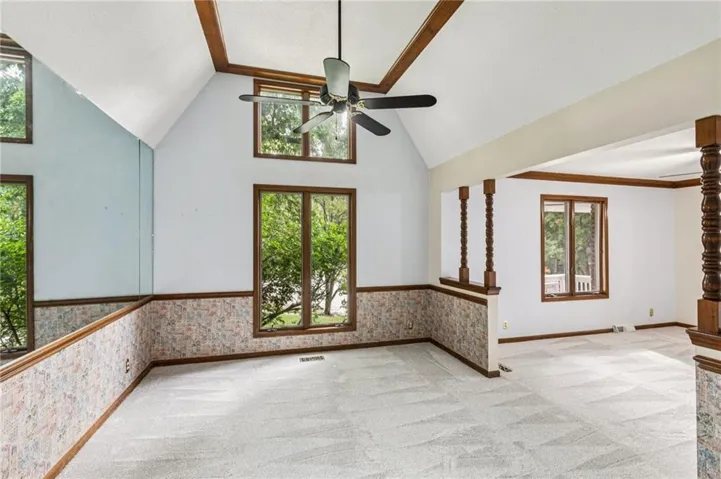Upstairs, the main level invites you in with a warm & welcoming layout: a great room w/ soaring cathedral ceilings, a classic brick fireplace, built-in bookcases, and rich wainscoting which covers the walls. \r\n