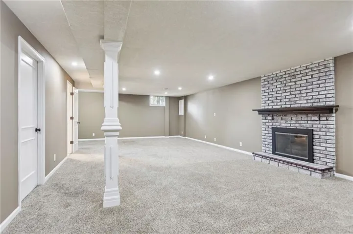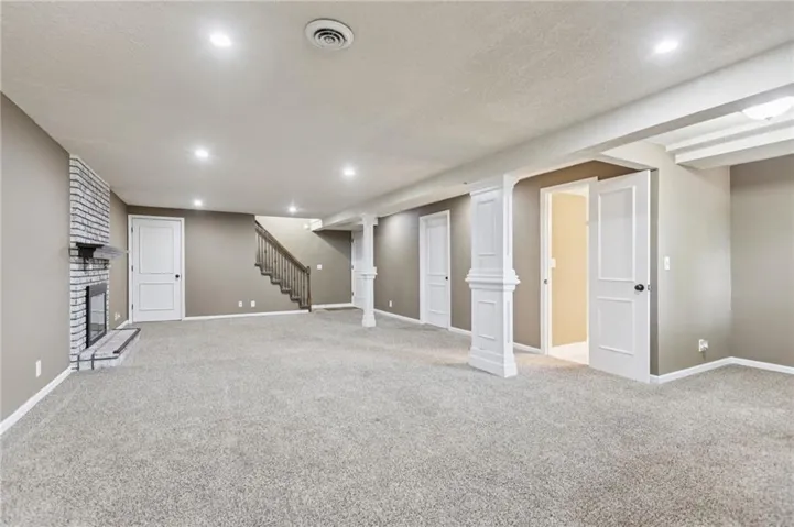 "LongDescription" => "Empty room with light carpet, ceiling fan, and wood walls"