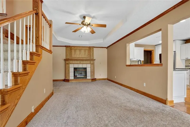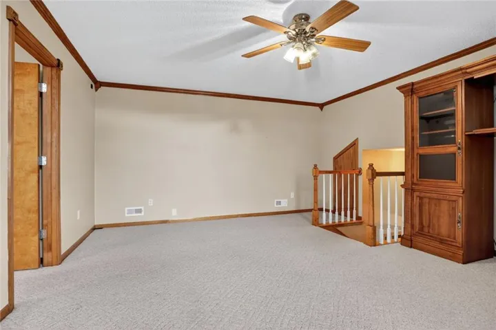 "LongDescription" => "Empty room featuring ceiling fan, light colored carpet, arched walkways, and wood walls"