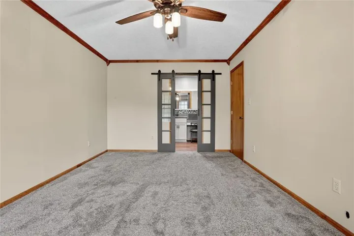 "LongDescription" => "Unfurnished bedroom with light colored carpet, a closet, a ceiling fan, and wood walls"