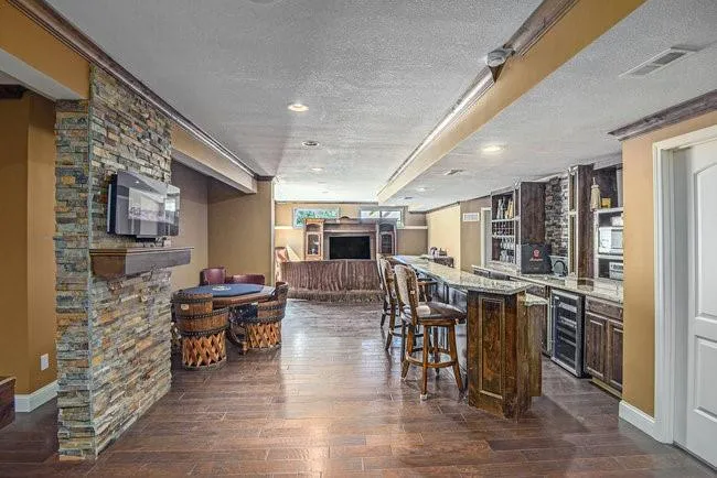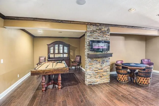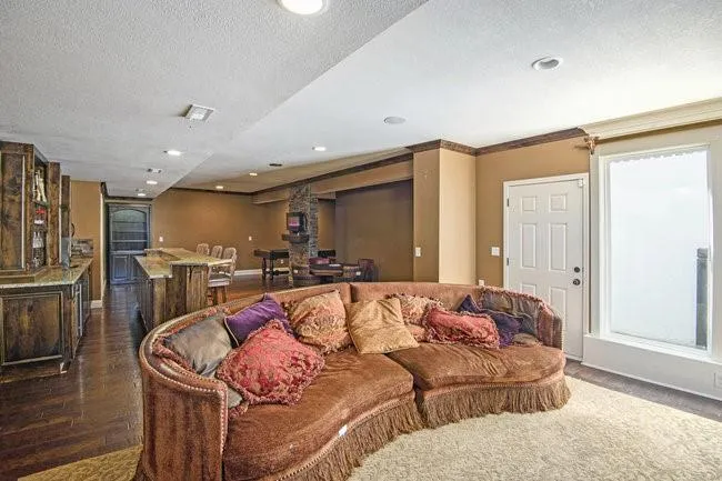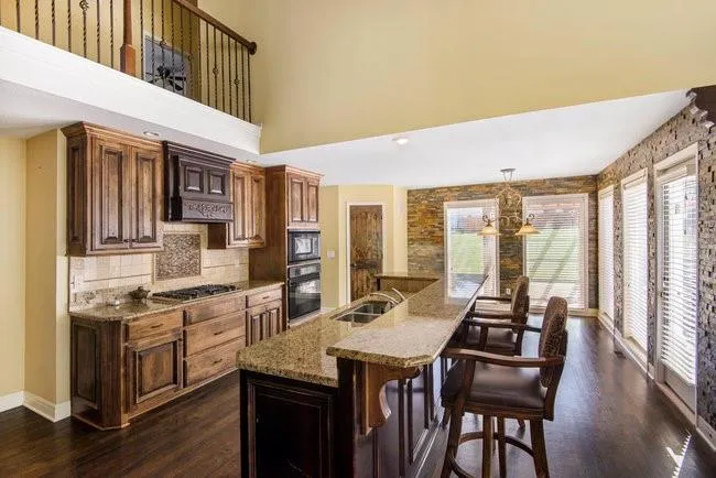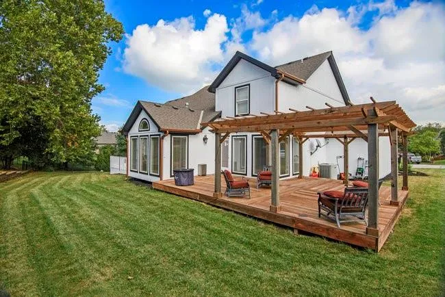 This 5 bedroom, 4.5 bathroom home offers over 3,343 square feet and is conveniently located minutes from shopping, dining, and downtown Kansas City. Features include fresh paint on exterior of home, brand new gutters, a beautiful kitchen with updated cabinets, three living areas, two dining spaces, a dedicated theater room, a full bar in the basement, and a gym room downstairs. The home also includes a non-conforming bedroom upstairs, vaulted ceilings, well-appointed bathrooms, a walkout basement, a wooden pergola with deck, and a three-car garage on a quiet cul-de-sac with a wide driveway.\r\n