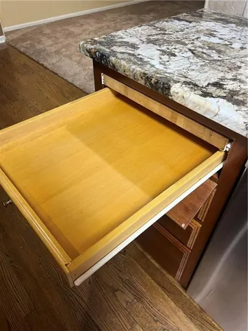"LongDescription" => "Kitchen featuring a breakfast bar area, gray cabinets, light stone counters, glass insert cabinets, and ornamental molding"