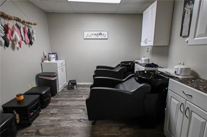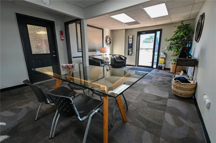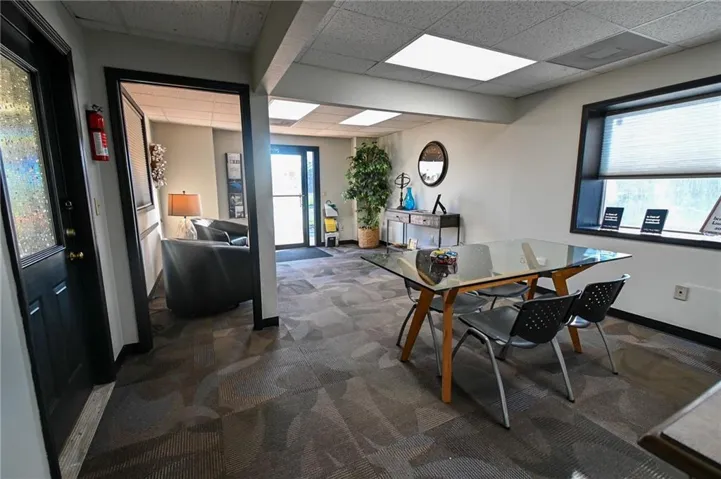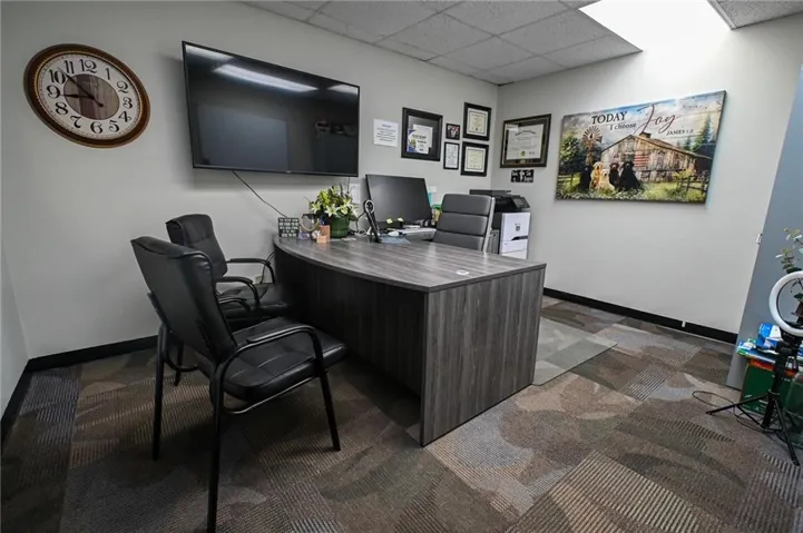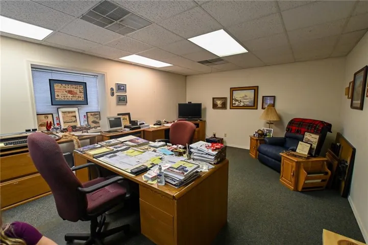 "LongDescription" => "Office space with a paneled ceiling and dark carpet"