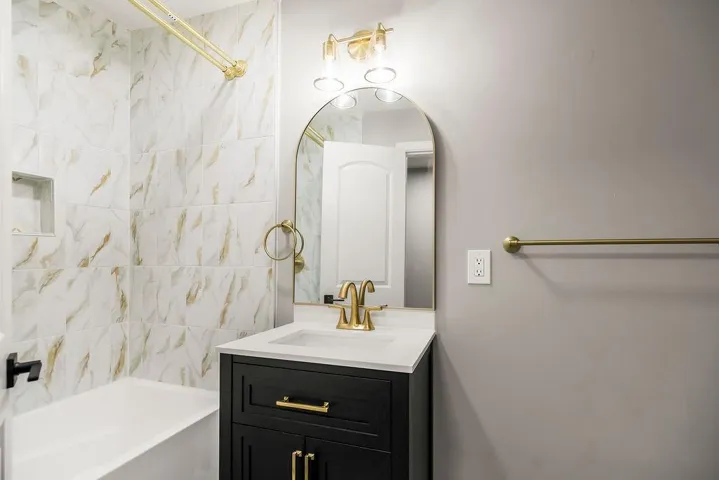"LongDescription" => "Full bath featuring double vanity, a shower stall, and light tile patterned floors"