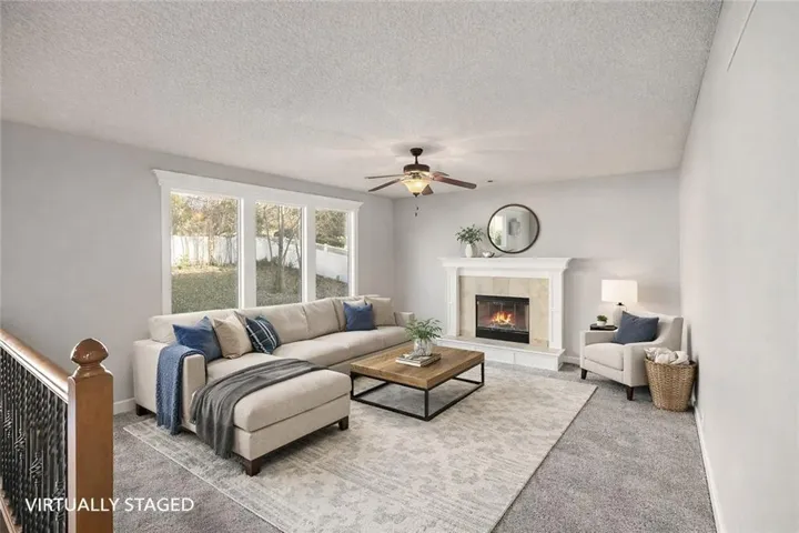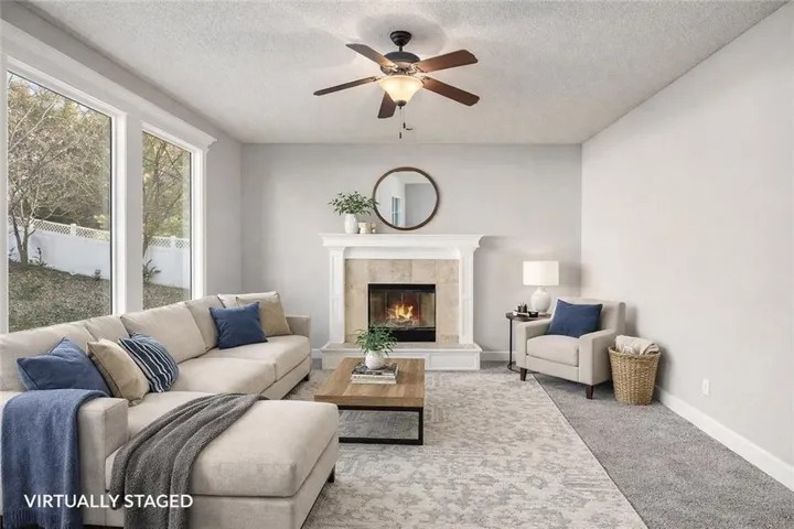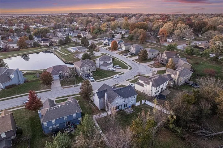 Exterior highlights include a 3-car garage, concrete patio, level yard, and thermal windows. Built by Mather, the home sits in a community offering a pool, lake, greenspace, and miles of trails, and is positioned adjacent to Raymore City Park for quick access to fields, walking paths, and open recreation space. Nearby access to local shopping, grocery options, coffee, and I-49 adds daily convenience.