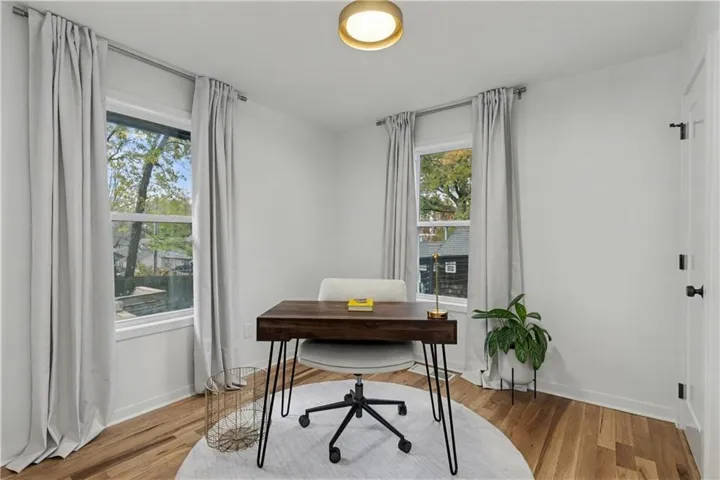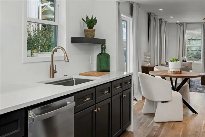 Step inside to a main level that is bright, warm, & modern. White oak hardwood floors, designer fixtures, & sleek 2” mud-in downlights create a clean, elevated look. Showstopping kitchen features a dramatic custom barrel ceiling, quartz countertops with a waterfall edge, soft-close custom cabinetry, S/S appliances, & luxury finishes selected with intention. The main-floor bath delivers a rich, moody design with high-end tile, a custom vanity, & sophisticated accents. Two beautifully updated bedrooms complete the main level with new windows, doors, trim, lighting, etc.\r\n